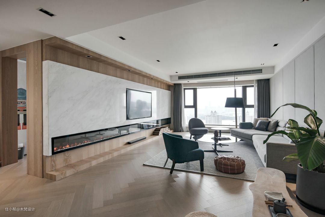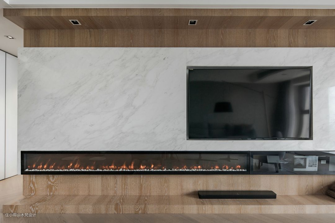 木饰面打造整体墙体造型,温润的木质肌理与天然大理石搭配,呈现冷暖平衡的和谐之美。嵌入式电视使空间更加简洁开阔,打开电子壁炉,跳动的火光为空间带来生机与温暖。