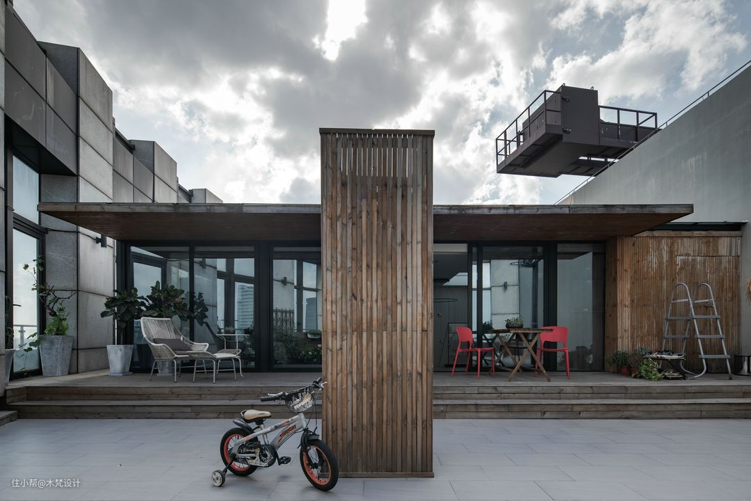 露台没有做复杂的花园,满铺防滑砖,给孩子安全舒适的活动空间。用防腐木做梁柱包裹中间的排气井,使空间美观整洁。