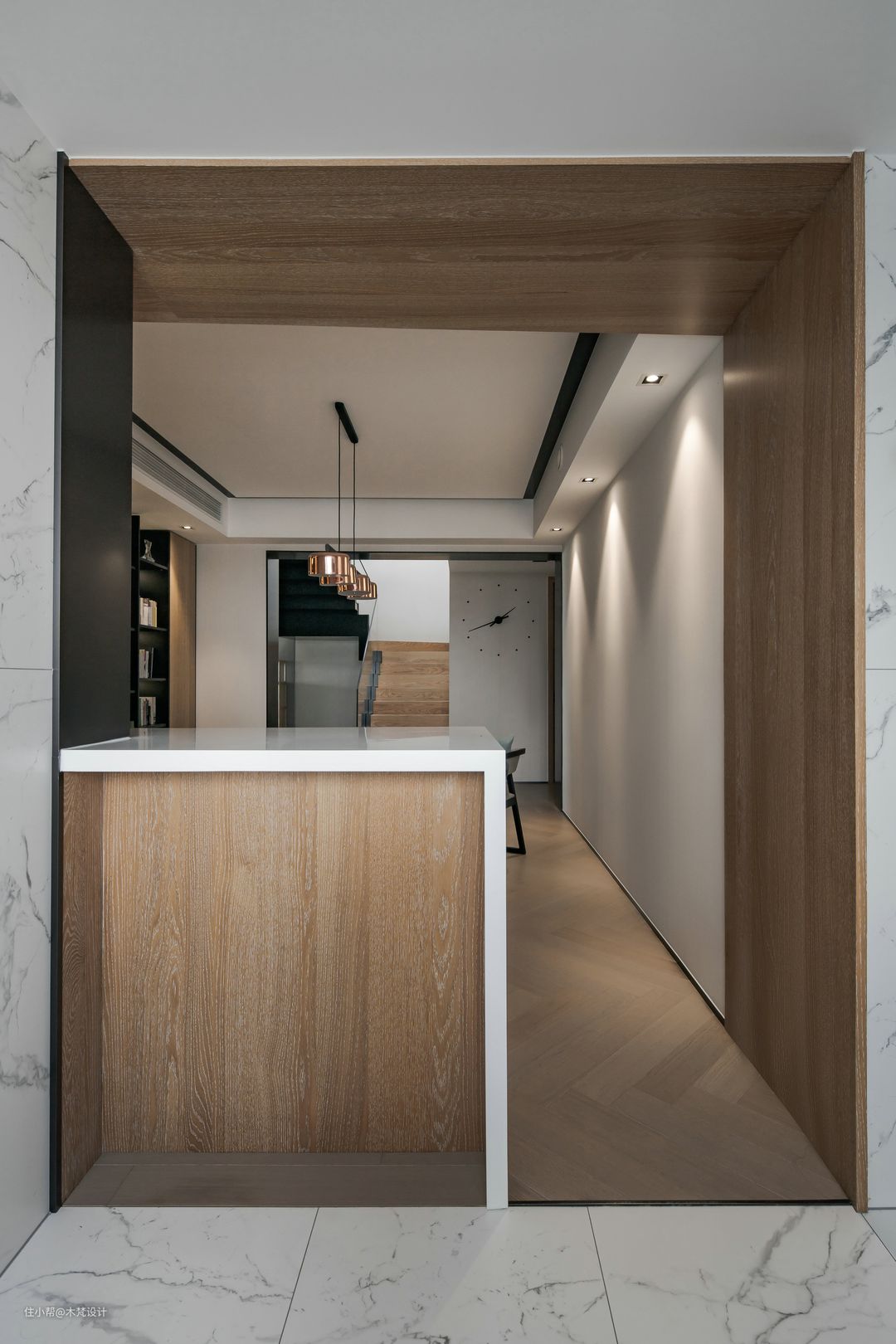 为了让楼梯区域通透却不空旷,楼梯下面做了分割和黑色不锈钢勾边,并用马来漆刷成灰色。对于细节的精心处理,使居住者更安心更舒适。