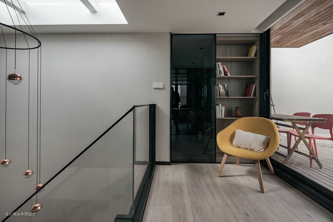 楼梯上来是连接衣帽间和家庭活动室的走廊,我们在一侧打造了阅读角,亮黄色的沙发椅柔软舒适,随手从书柜上取下喜欢的书,便可享受美妙的阅读时刻。黑色的玻璃移门既是书柜门也是房门,推到右侧就可以进入衣帽间,十分方便。
