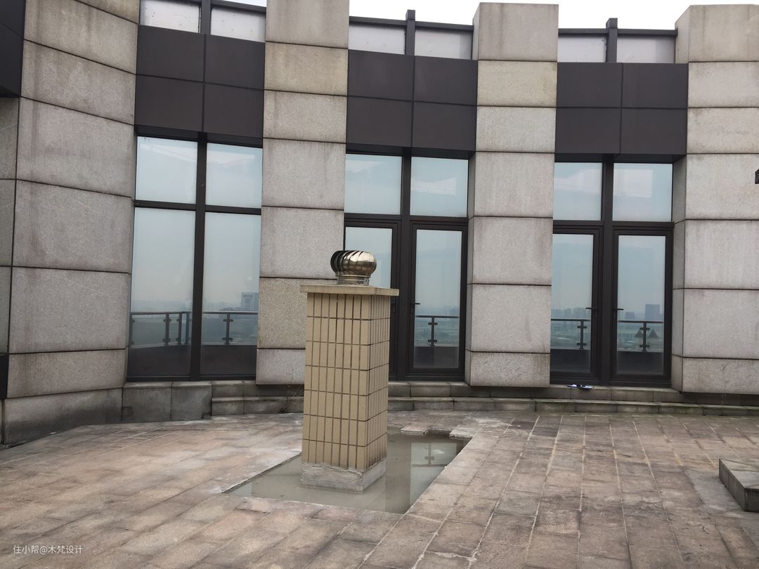 露台没有做复杂的花园,满铺防滑砖,给孩子安全舒适的活动空间。用防腐木做梁柱包裹中间的排气井,使空间美观整洁。