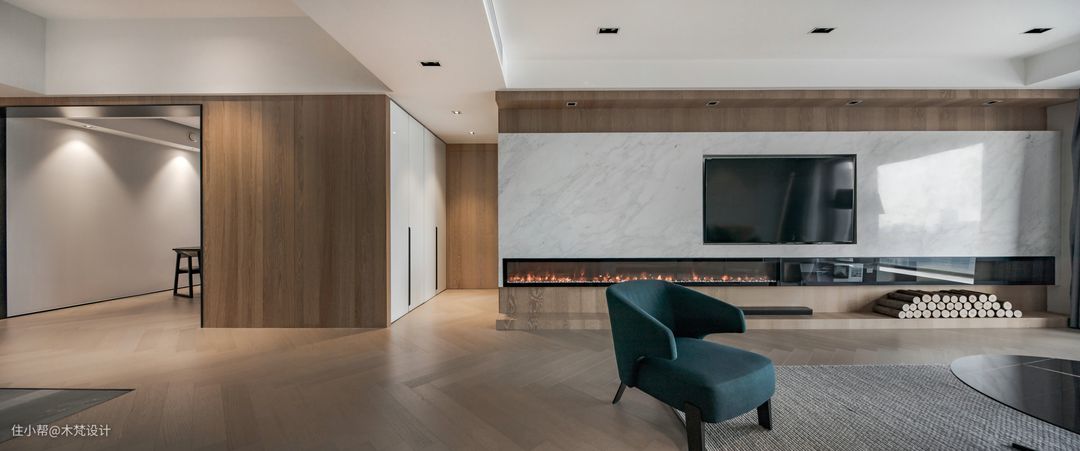 木饰面打造整体墙体造型,温润的木质肌理与天然大理石搭配,呈现冷暖平衡的和谐之美。嵌入式电视使空间更加简洁开阔,打开电子壁炉,跳动的火光为空间带来生机与温暖。