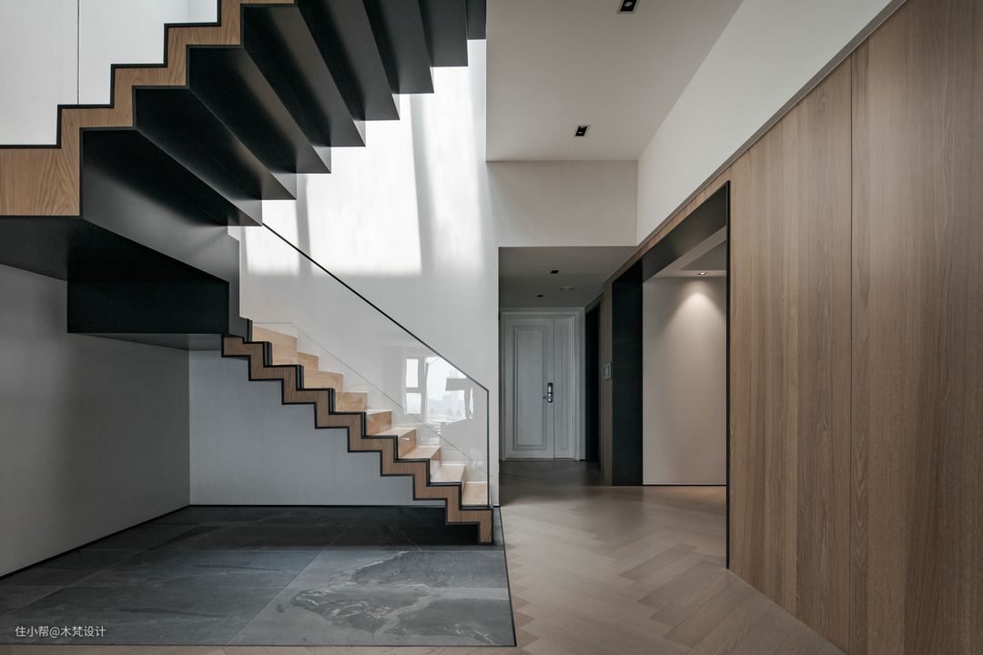 楼梯上方设计天窗,透明玻璃把自然天光引入室内,为轻薄精致的楼梯带来别具一格的美感。
