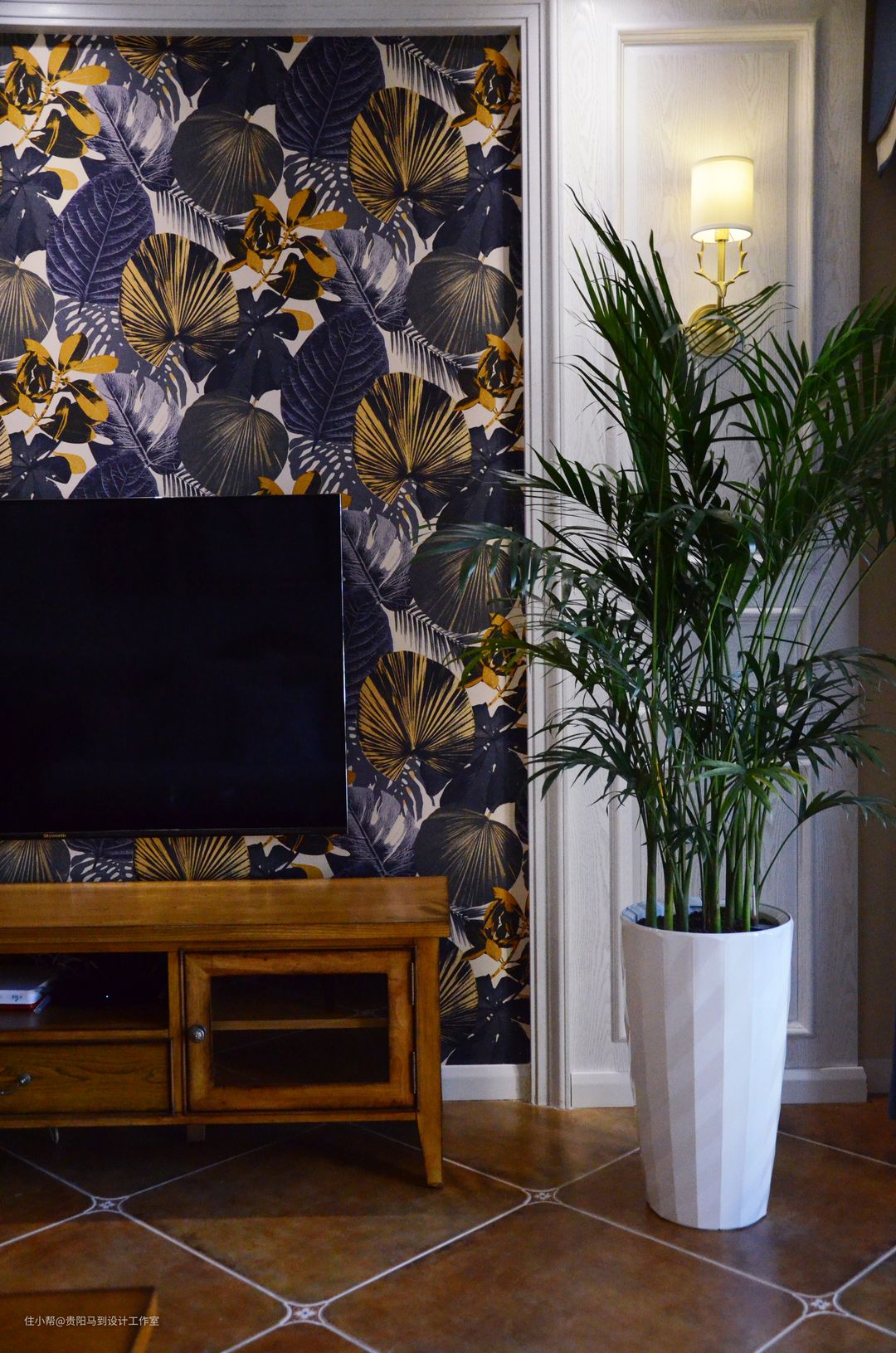 美式植物的标配是一直考虑是散尾葵,不过由于形体过于高大只好选用小椰树,不过和背景墙的粽叶出奇的相配。