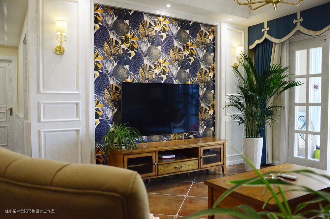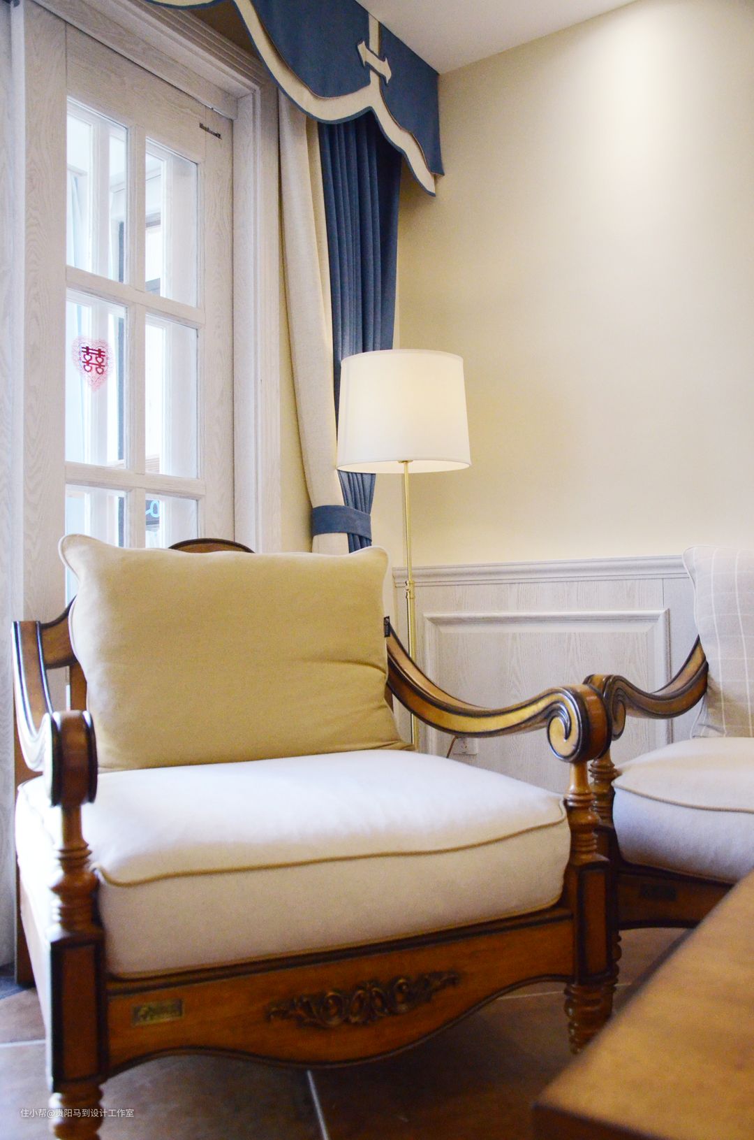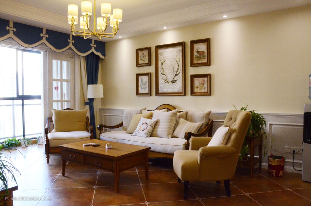 沙发在选择的时候很明确就是布+木,虽然市面上很多美式沙发,但是相中一套很不容易,几乎跑遍了所有贵阳的家具展厅,才找到这组沙发,再加上白色的实木护墙板,很到位!在这套作品完成后,我无意中发现一家窗帘店的有沙发中间的原配小抱枕的布艺样板,实属可惜,如果当是选窗帘时有幸发现,就可以把米色的两条褶皱更换了。