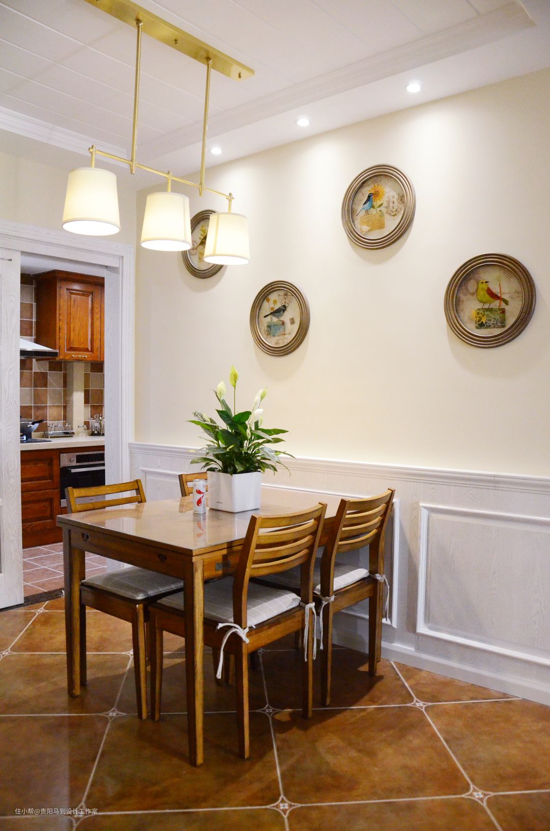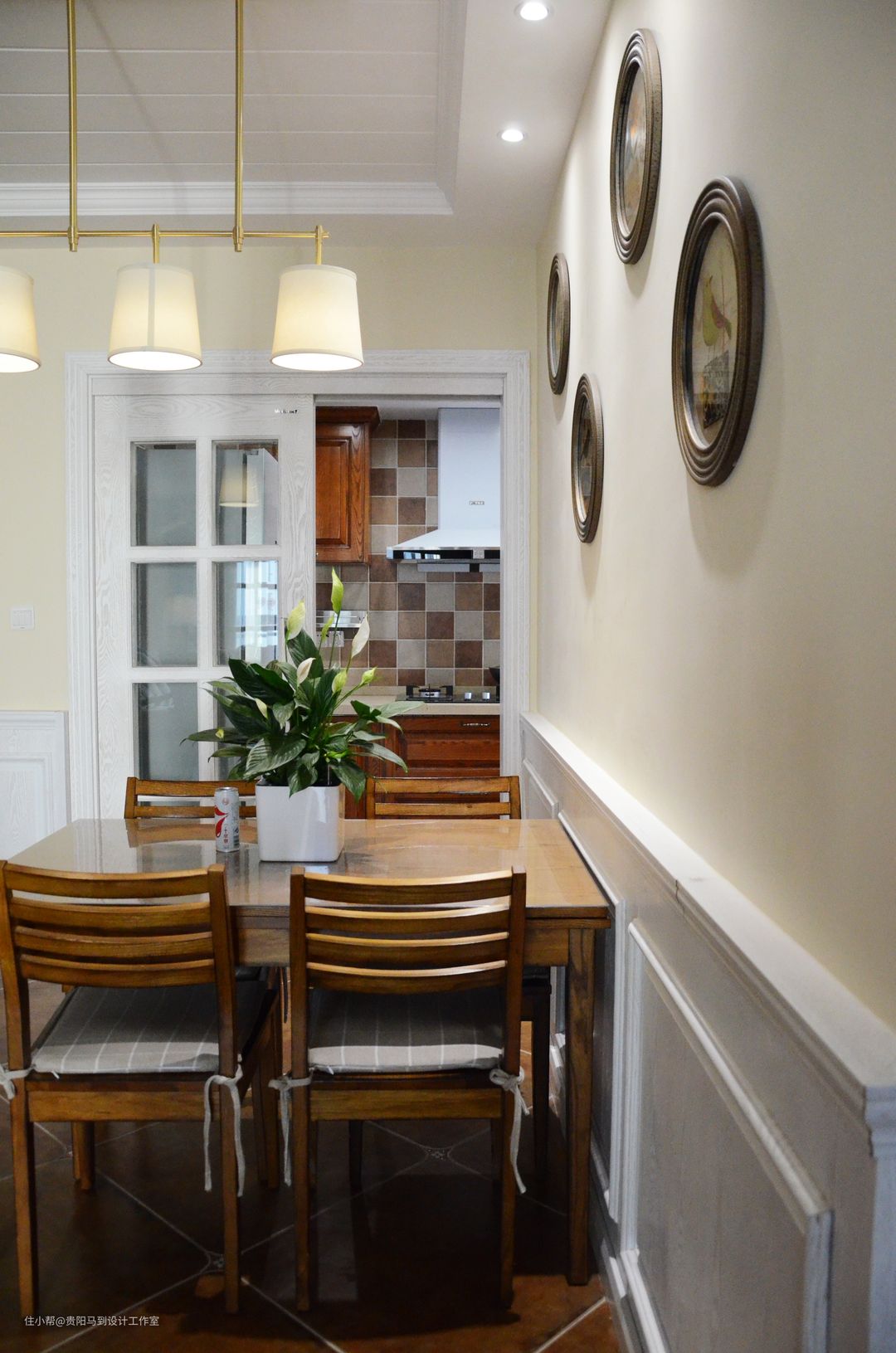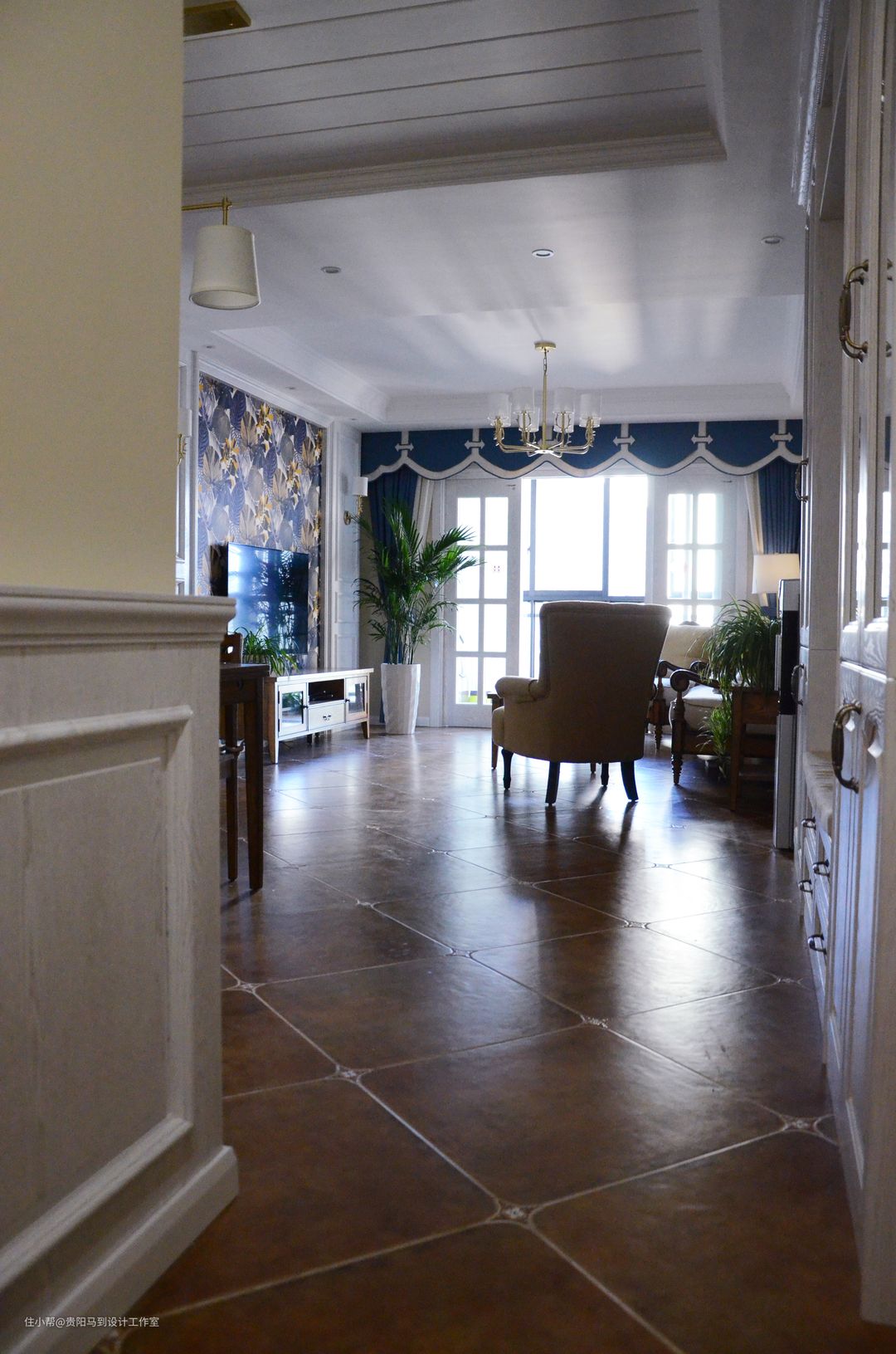 沙发在选择的时候很明确就是布+木,虽然市面上很多美式沙发,但是相中一套很不容易,几乎跑遍了所有贵阳的家具展厅,才找到这组沙发,再加上白色的实木护墙板,很到位!在这套作品完成后,我无意中发现一家窗帘店的有沙发中间的原配小抱枕的布艺样板,实属可惜,如果当是选窗帘时有幸发现,就可以把米色的两条褶皱更换了。