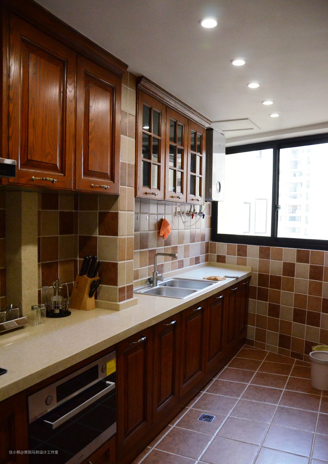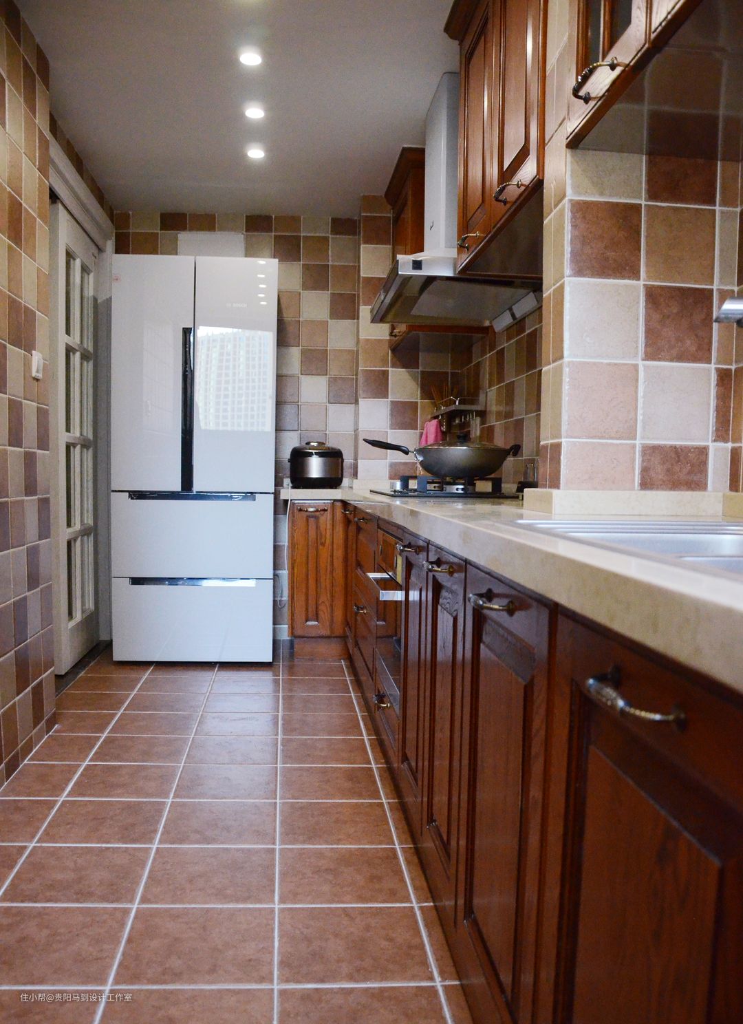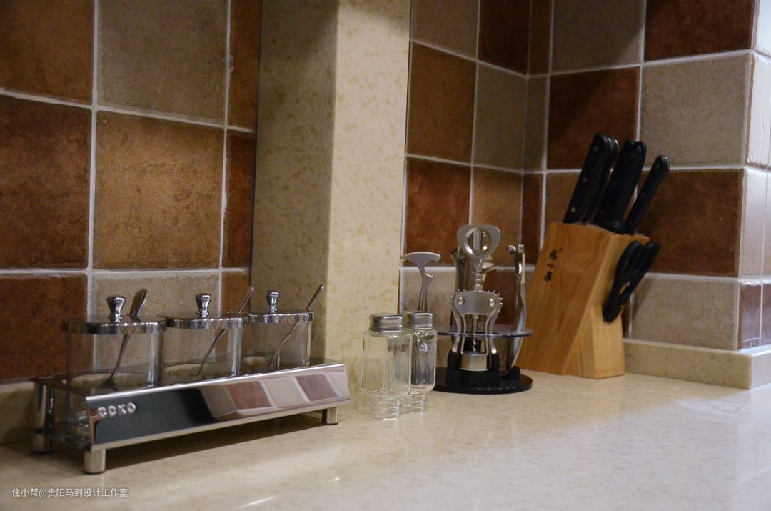 总的来说厨房的设计是最为传统的:1没有做开放式;2没有去匹配更多的罗马柱。只是传统的格子瓷砖铺贴厨房。这里忘记特写厨房了,是实木门板,但柜体是304不锈钢的,确确实实的橱柜里面的精品。
