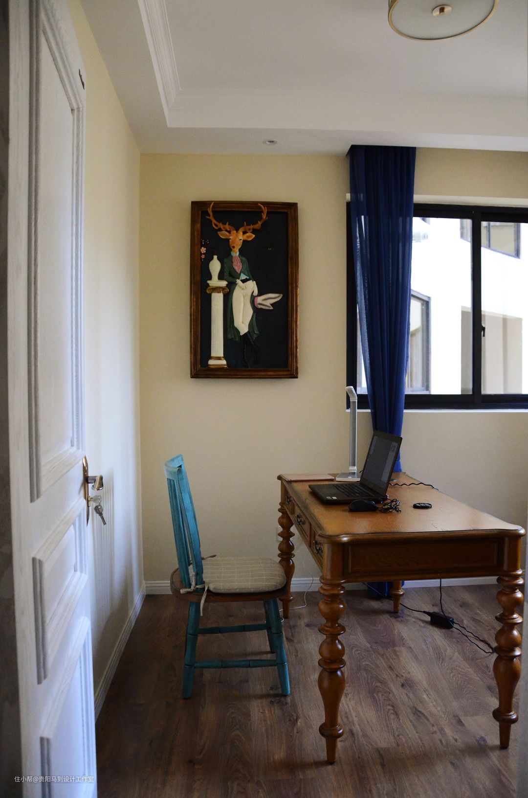 蓝色的纱幔搭配湖蓝的竹节椅子,给书房一种宁静的舒适感。墙面的立体鹿先生挂画把空间点的活形活现。