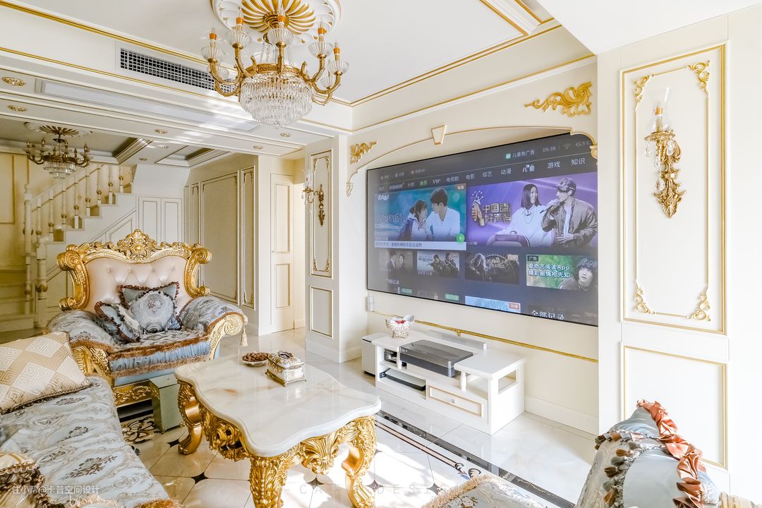客厅金色元素凸出,宫廷欧式风格沙发茶几,质感很强