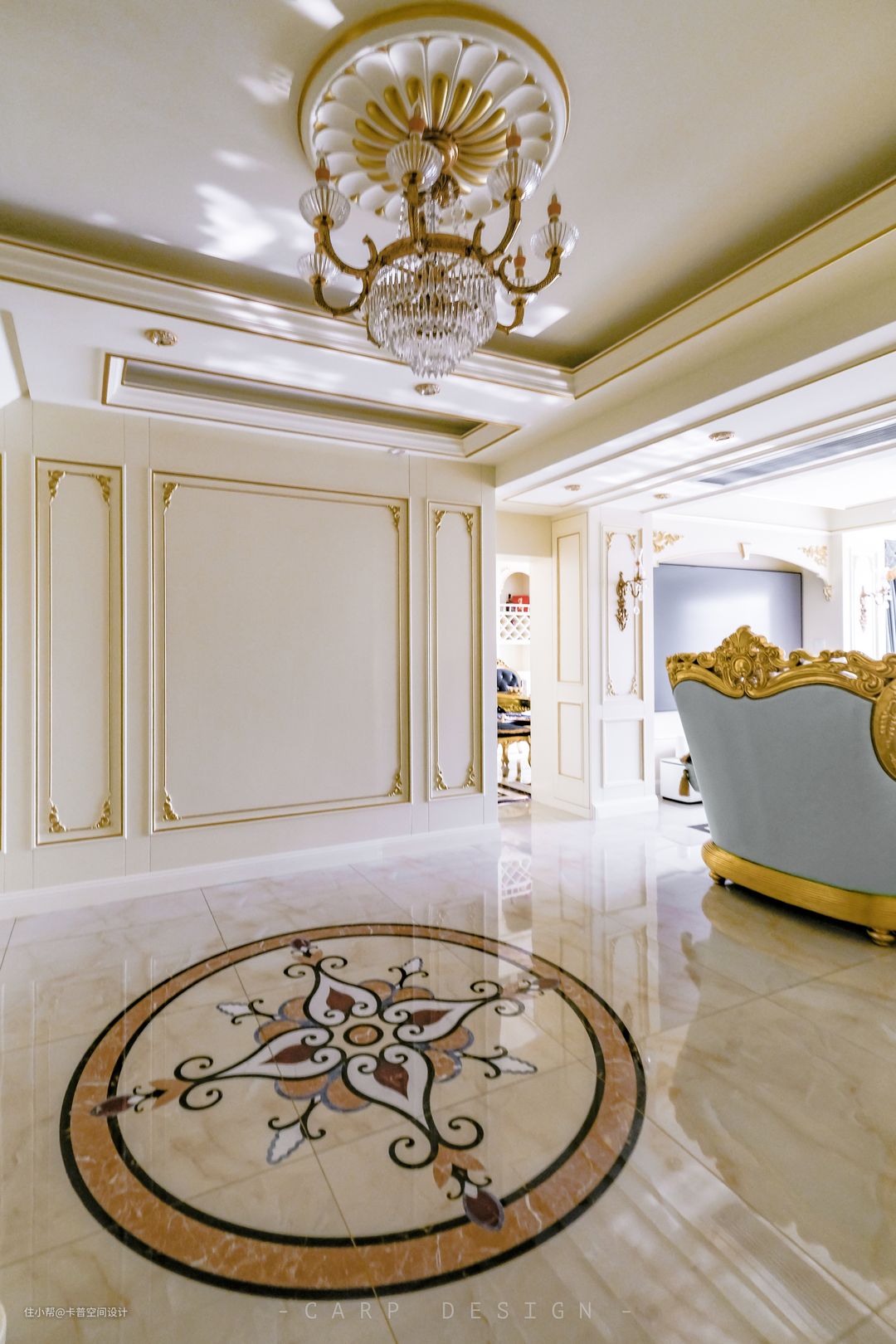 入户吊灯为金色水晶大灯,配合地面与墙面的元素,搭配大气