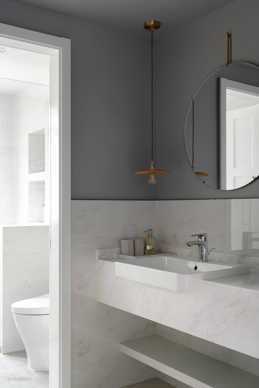 原主卫改为客卫,干湿分区能减少早起争抢卫生间的尴尬。由于原始尺寸限制采用台上盆会限制走动空间,半挂盆尺寸小,刻意缩短洗手台位置没有设置任何储物功能。把收纳功能设计在洗手台侧面高柜。#卫生间 #洗手台 #镜子