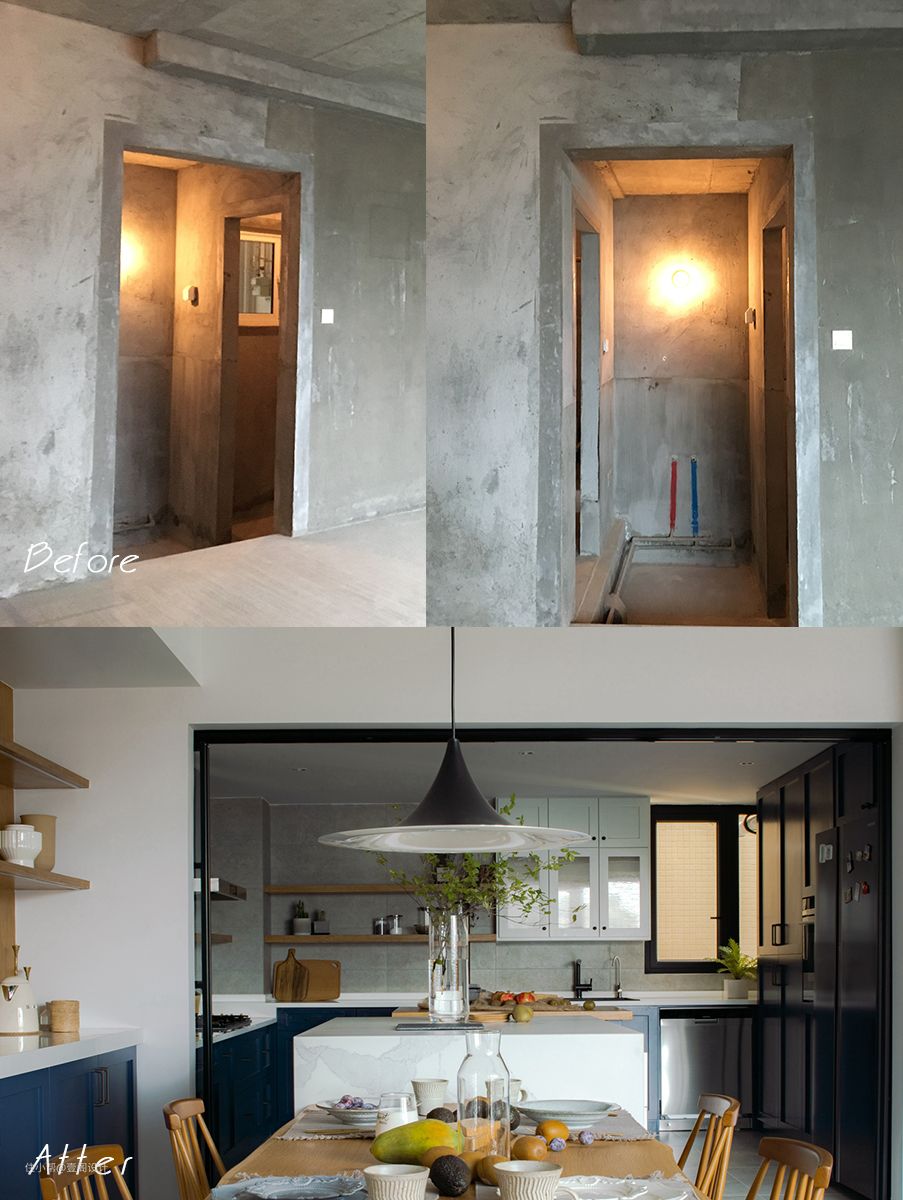 原厨房正对客卫,面积小使用局促。于是我们敲掉非承重墙做成开放式厨房,在功能上区分了中西厨区。#厨房 #开放式厨房 #餐桌 #橱柜