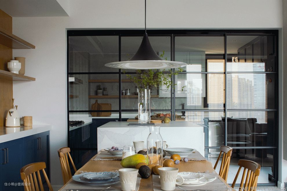 至于油烟问题,我们采用了推拉门“隐藏”设计,日常开放,做饭时拉出来形成良好的密闭空间防止油烟。#餐厅 #餐桌 #推拉门 #灯具