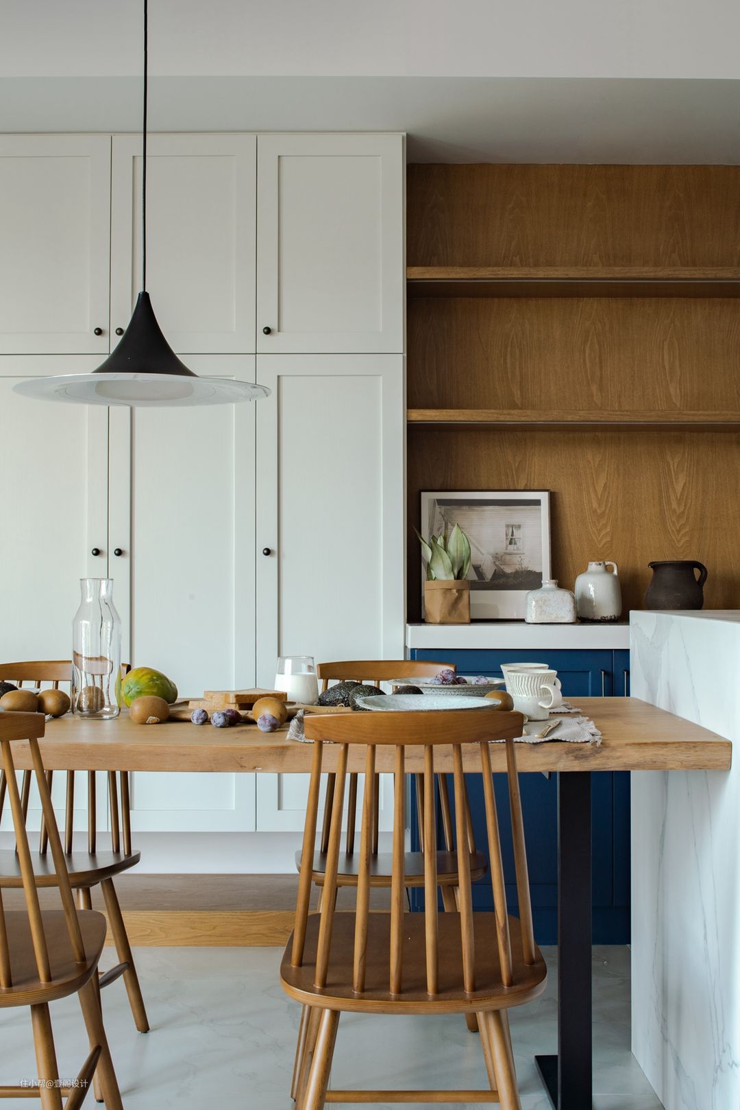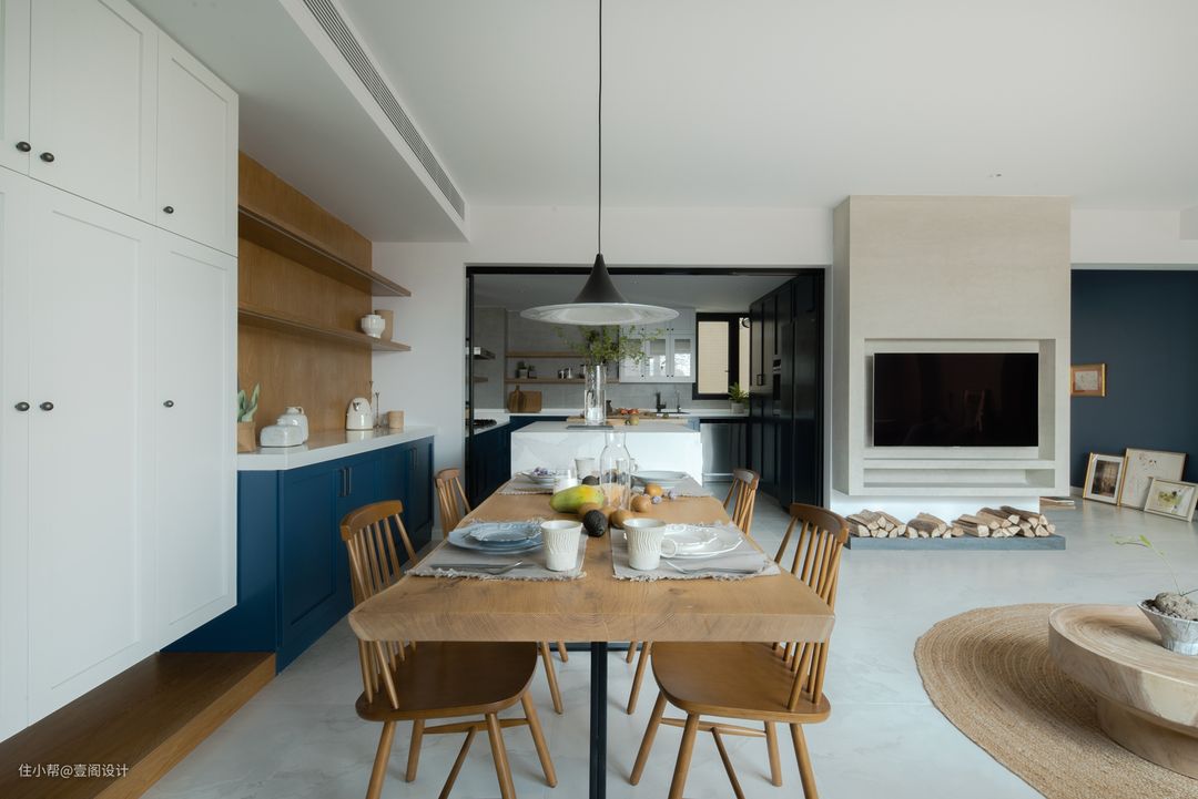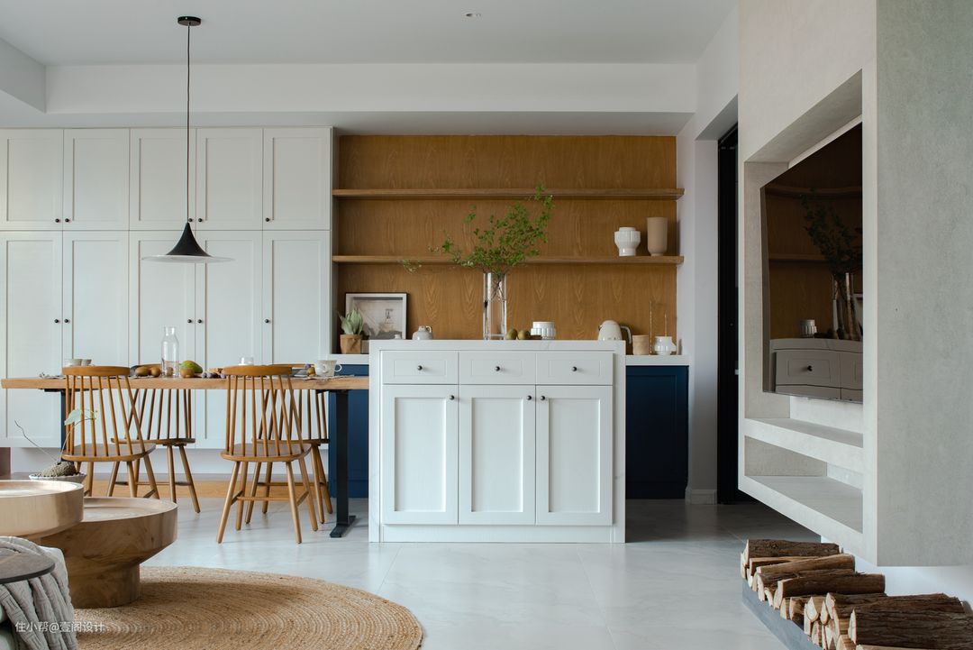 烹饪、上菜动线明确,餐桌旁增设岛台增加储存空间,日常可以收纳一些厨房日用品及烘焙工具。#餐厅 #餐桌 #推拉门 #灯具