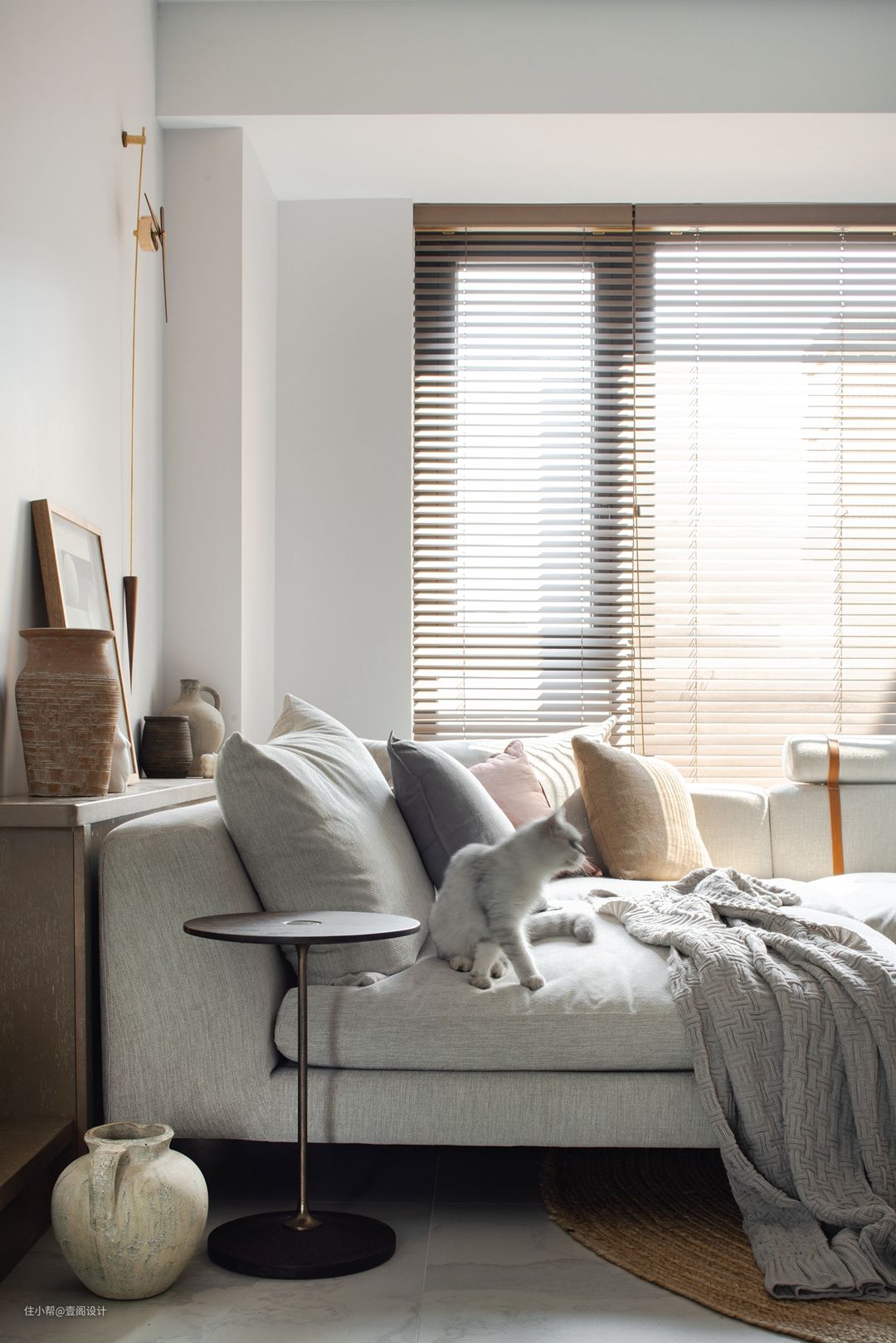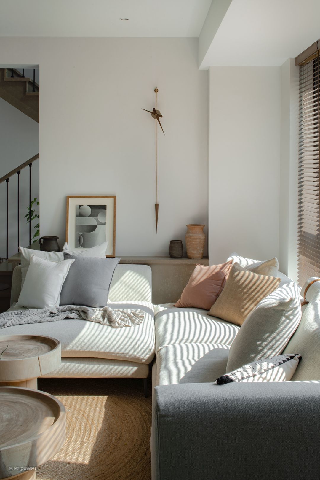 在娜娜家,即便不看挂钟也能感觉到时间的流淌。阳光从百叶缝隙偷溜进来的光影就是最好的说明。#客厅 #沙发