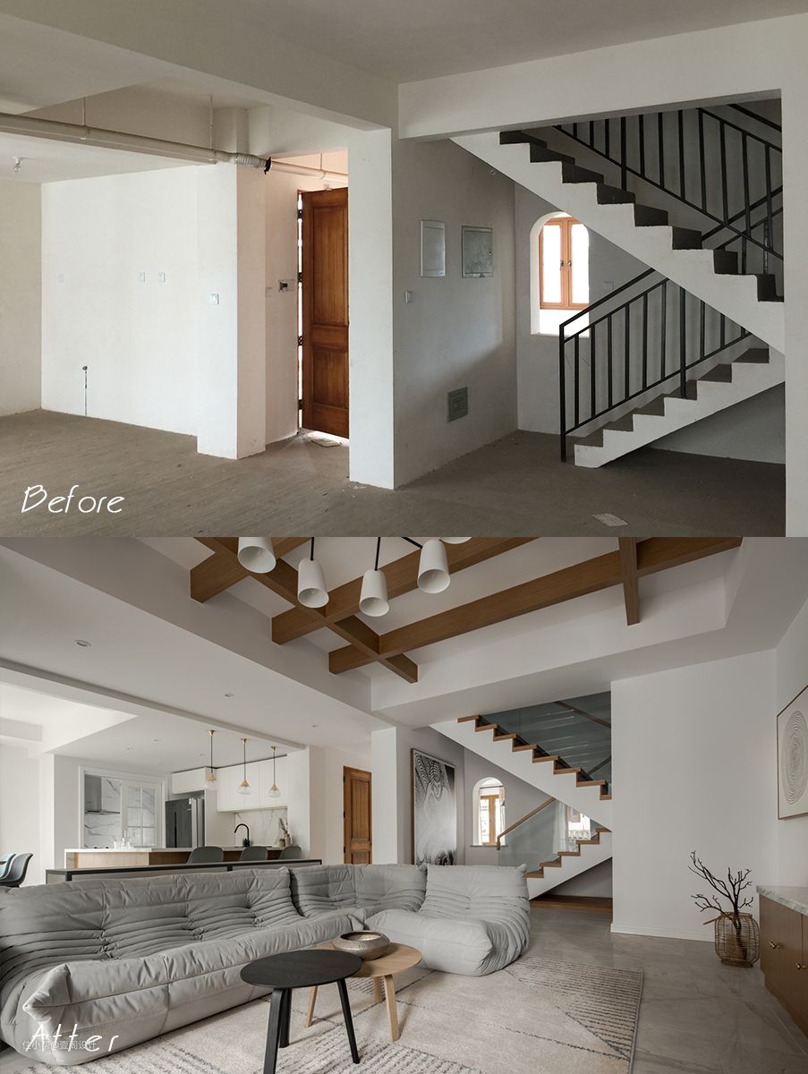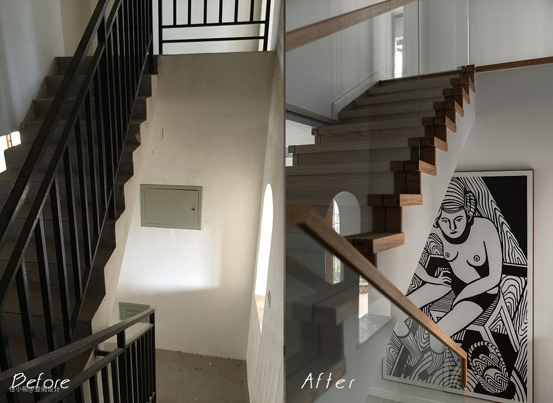 我们保留了原始结构的前提下,选择了与吊顶同色系材质楼梯踏步搭配透明玻璃附体简洁明快。细节部分选择了超大尺寸挂画遮挡配电箱。