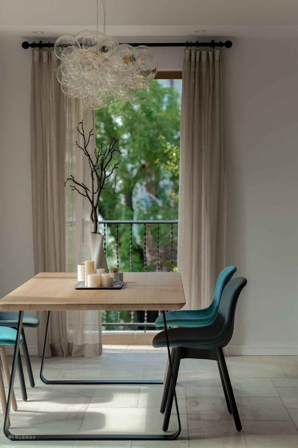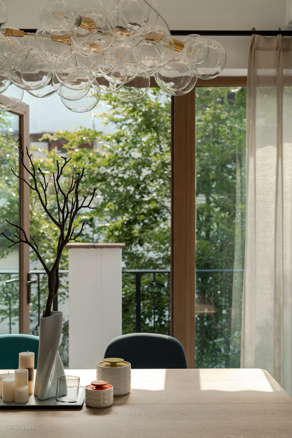 一楼客餐厅保留原建筑落地窗未做改动,通过棉麻纱幔+木质餐桌+孔雀蓝餐椅营造度假氛围。餐桌位于两扇落地窗正中采光充足,室外光线悄悄溜进房间。