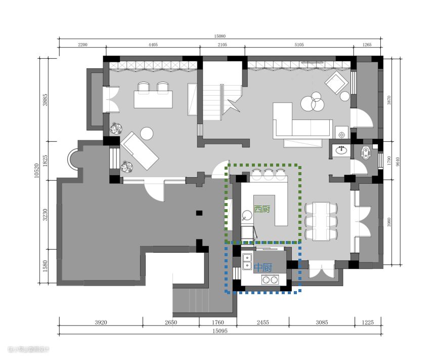 1.不改动结构的前提,把厨房划分为中西厨,兼顾中西厨烹饪习惯储物内容更合理,比如一些小家电、干货可以放在西厨区;中厨保留常规烹饪食材及厨具、餐具;