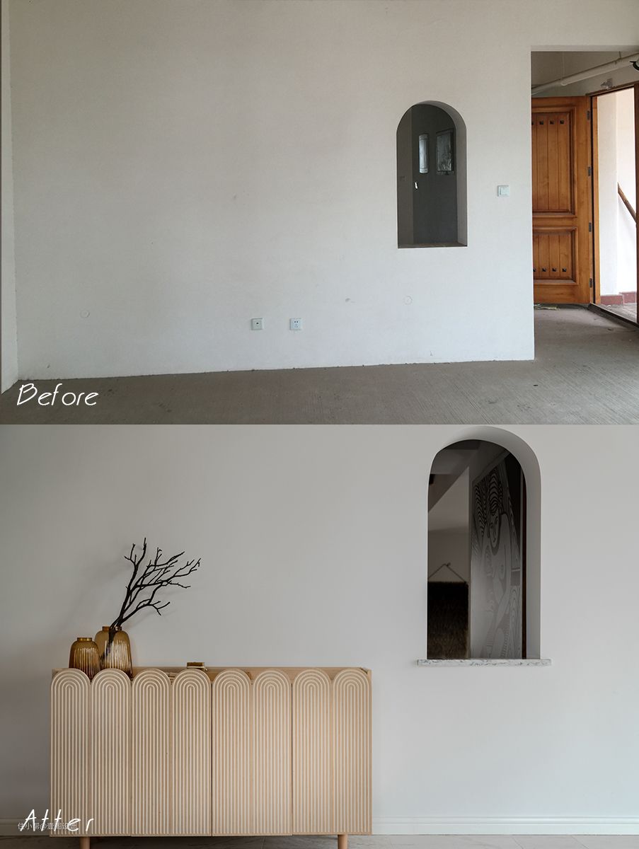 本案屋主是一对从事建筑相关行业的小夫妻,对建筑造型和内外环境设计要求极高。装修完毕后计划三世同堂与父母以及孩子一起居住。当初买房主要是看中了西班牙建筑外环境,上下班回家要通过地下停车场经过邻居家二楼外阳台,才能到达三楼的房子,但这也丝毫不影响他们对于这套房子的喜爱。
