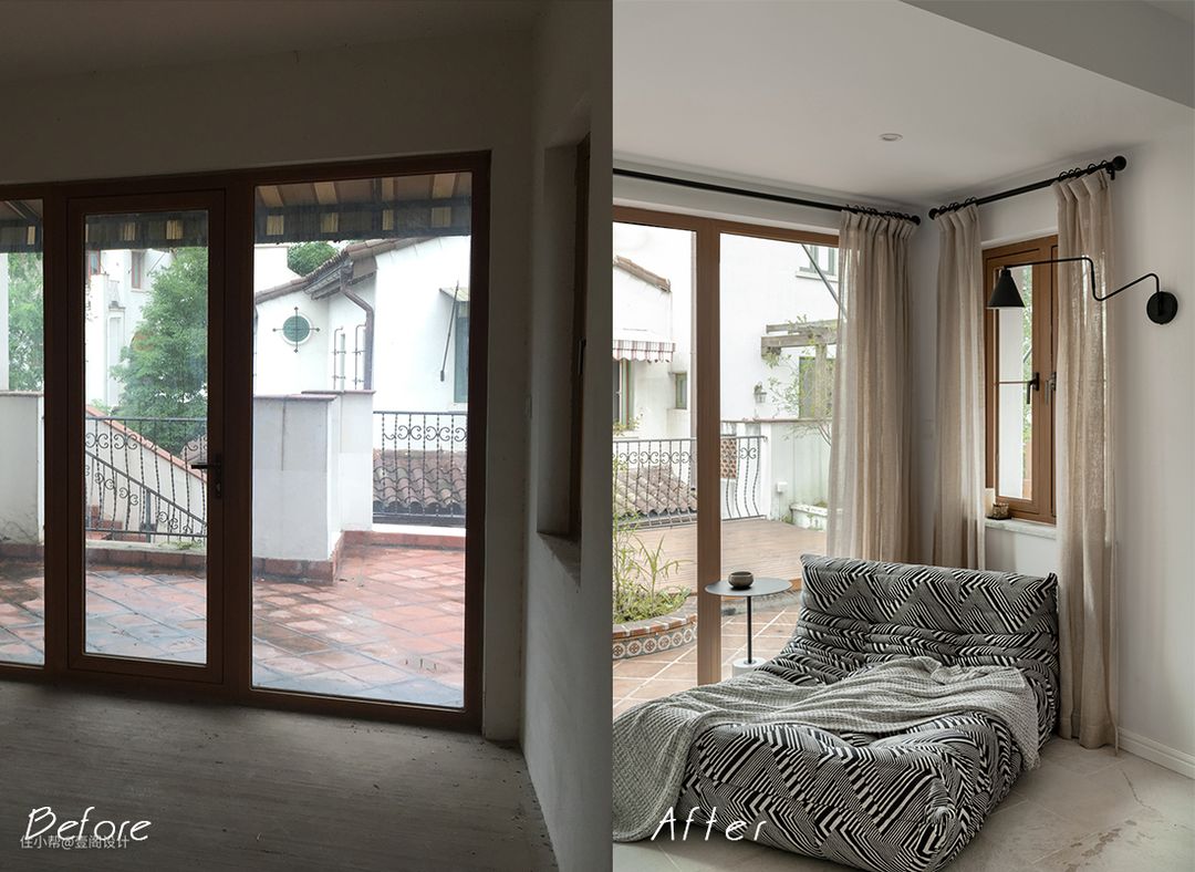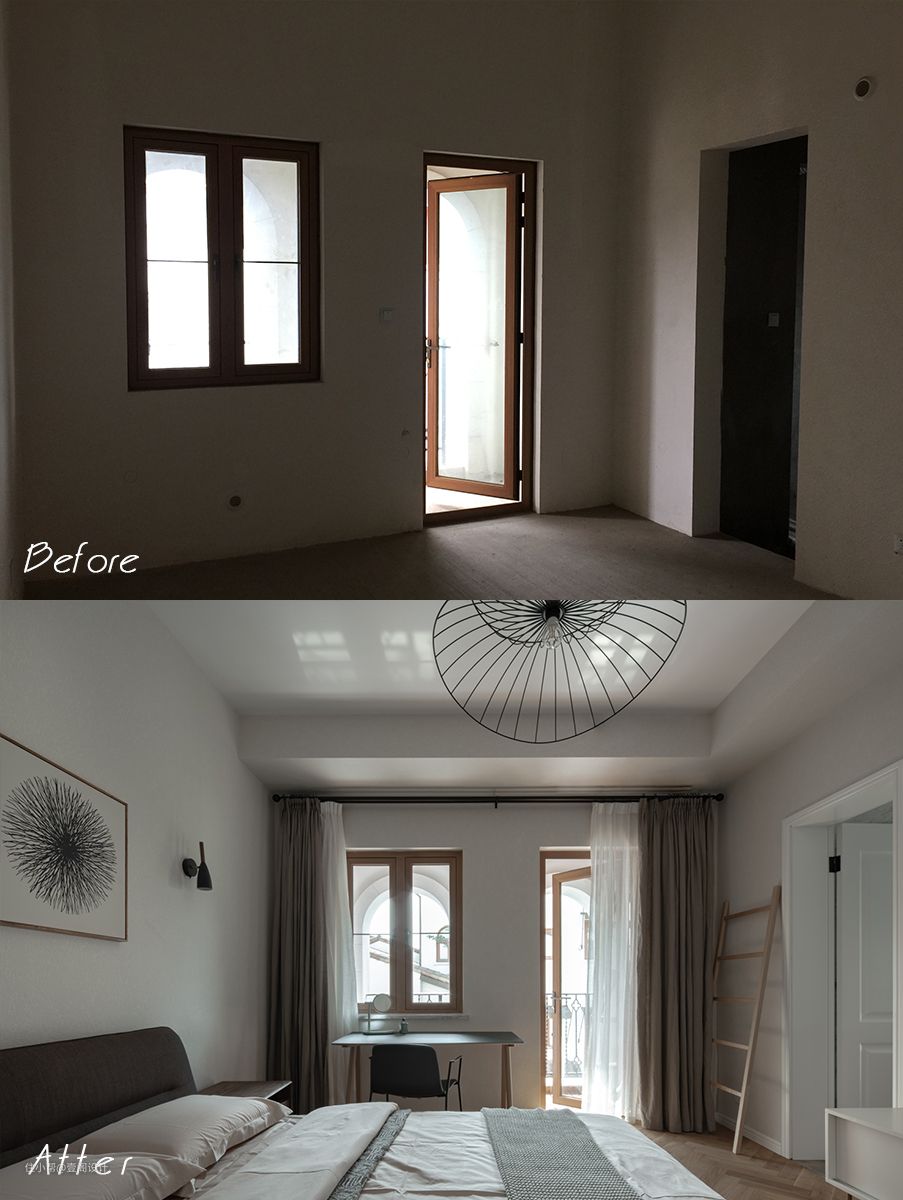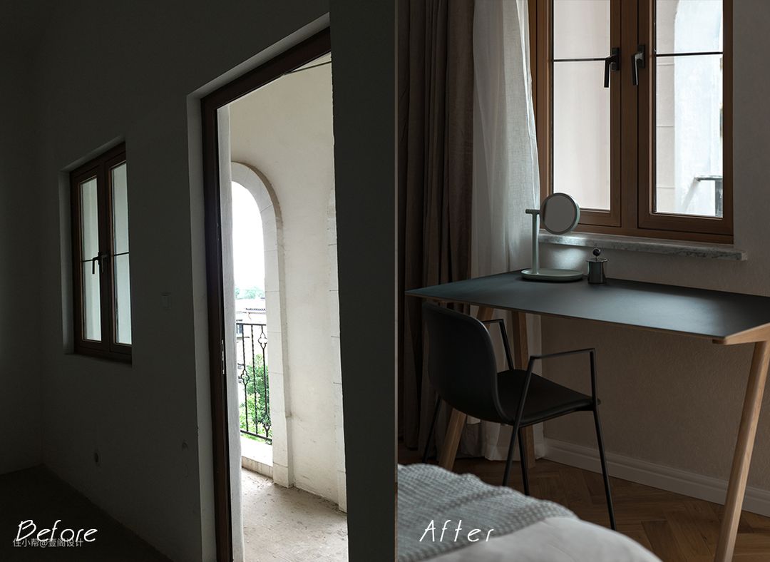 A:最大的问题是二楼的卫生间和洗衣房的位置,由于房子是国外设计师的建筑,洗衣房做到了室内过道空间。两个卫生间的使用路线,非常不方便。因为建筑体决定了无法改变太多墙体,只能在保持本身功能性的前提下,尽量优化活动路线让使用更方便。主卧卫生间基本没改动,次卧则采用开两道门共用一个卫生间。这样既保持相对的睡眠空间独立,在使用卫生间的时候也不用从一个房间穿到另一个房间使用。