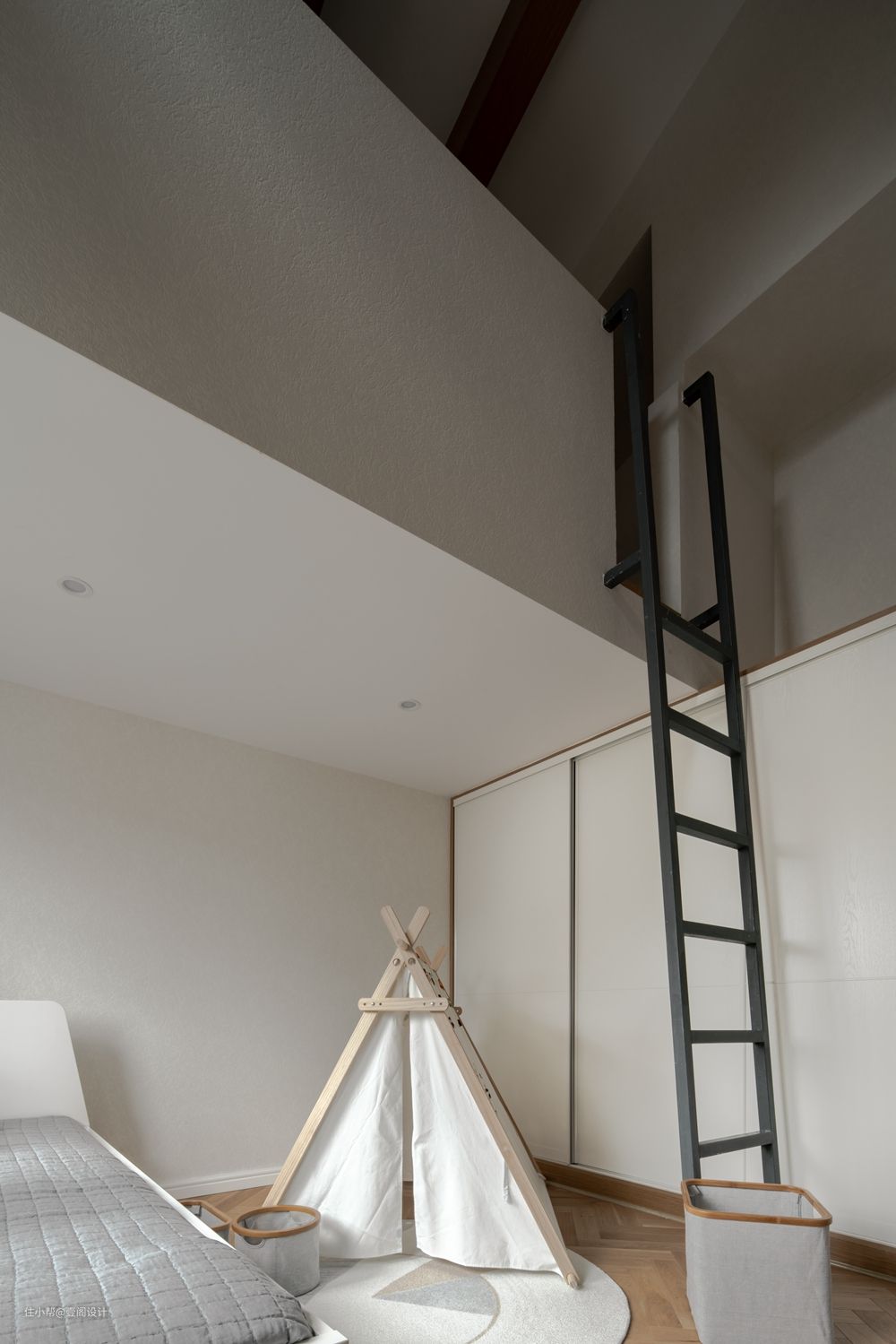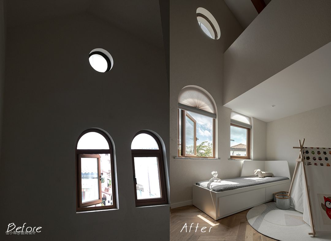 原儿童房是xm挑高空间,在儿童成长阶段刻意培养孩子的探索与好奇心非常重要。而这一点也是我们在为有孩子的家庭做未来居住计划时首要考虑部分。于是我们跟屋主夫妻俩沟通后最终确定了这个方案。