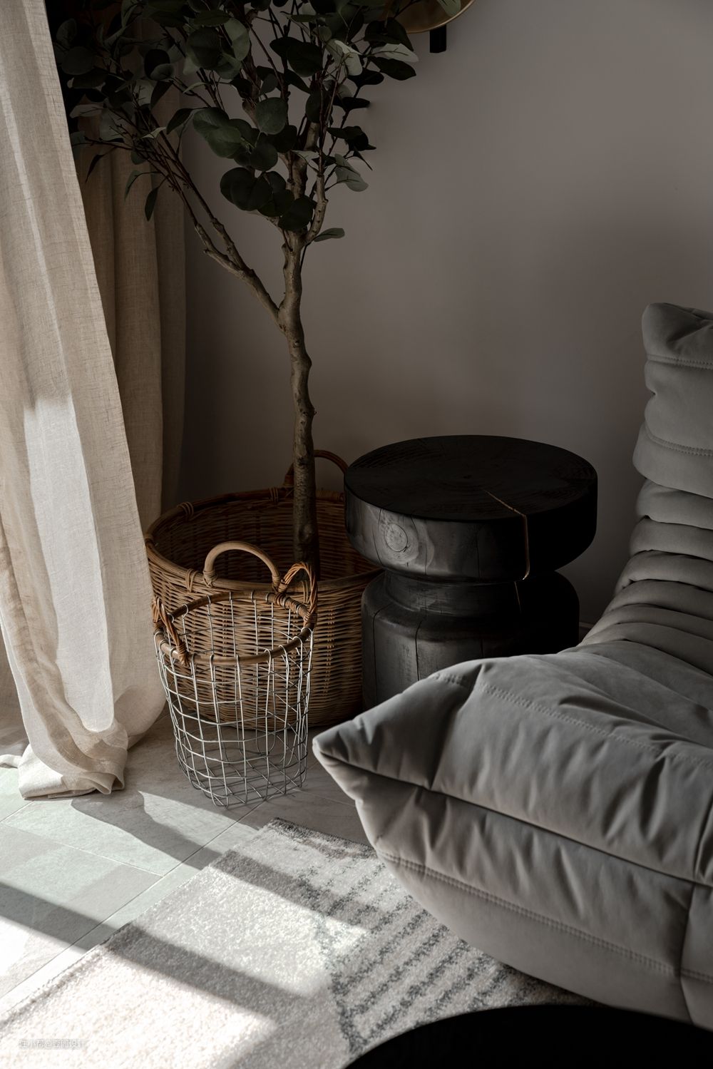 客厅一角,随意摆放着藤编狂绿植给空间注入活力与生命力。