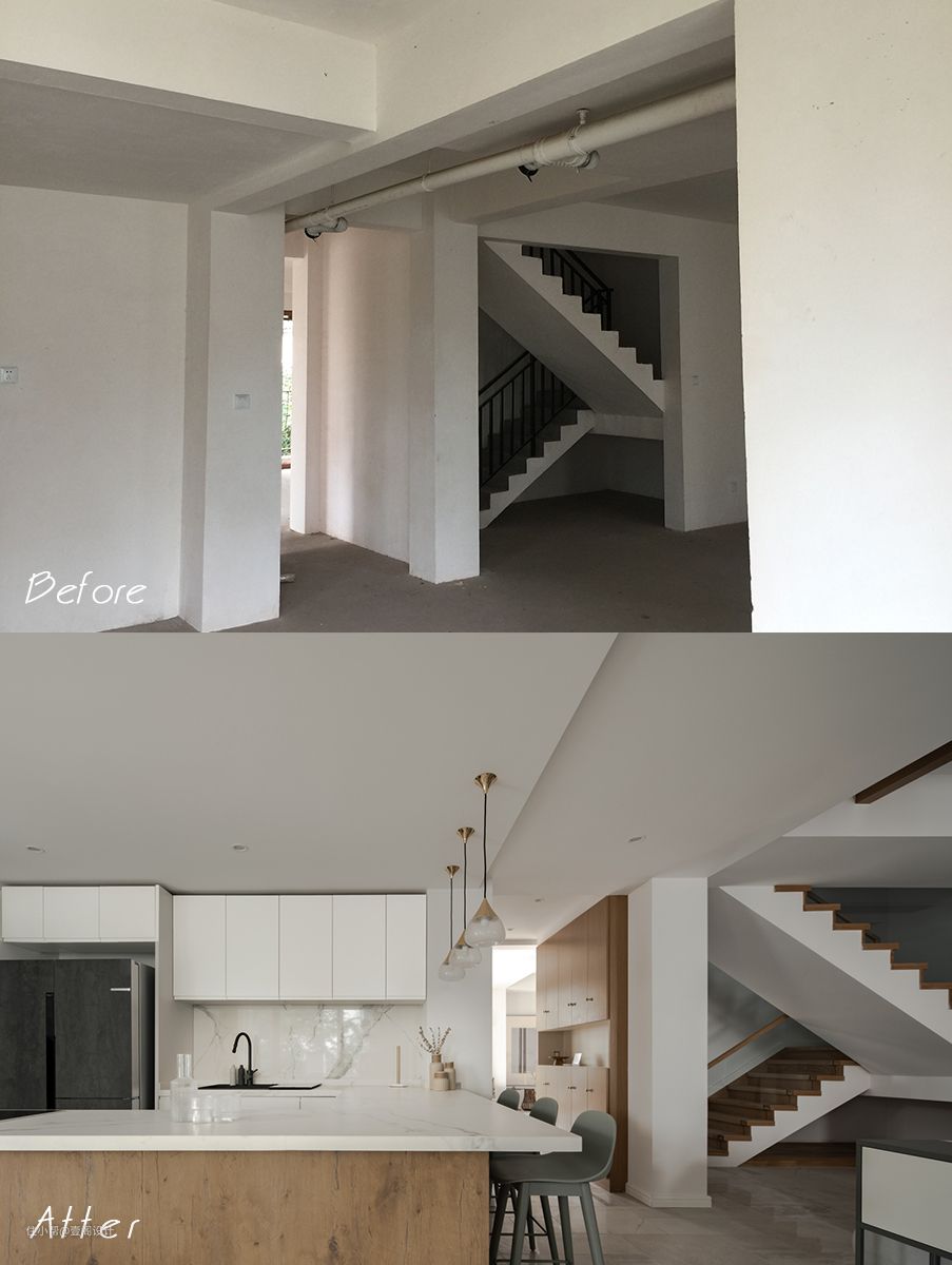 A:整体氛围,极简不单调。从功能来讲,屋主小夫妻是从事建筑行业出身,对于功能区的需求非常明确。需要严格划分公共空间、功能空间。在这部分,大多数的独立工作室基本都能满足。可在此基础上把控整个房屋的氛围和细节恰恰是他们最关注的。他们觉得过繁琐的装饰堆砌除了在今后使用中略显鸡肋外别无他用,简洁明快的表达才是最高级的空间呈现。