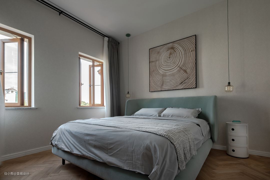 我们让父母房起居空间回归极简原生。色彩沿用和一楼客厅一致的低饱和度色系,地板采用实木人字拼,使空间满盈安稳的舒眠氛围。