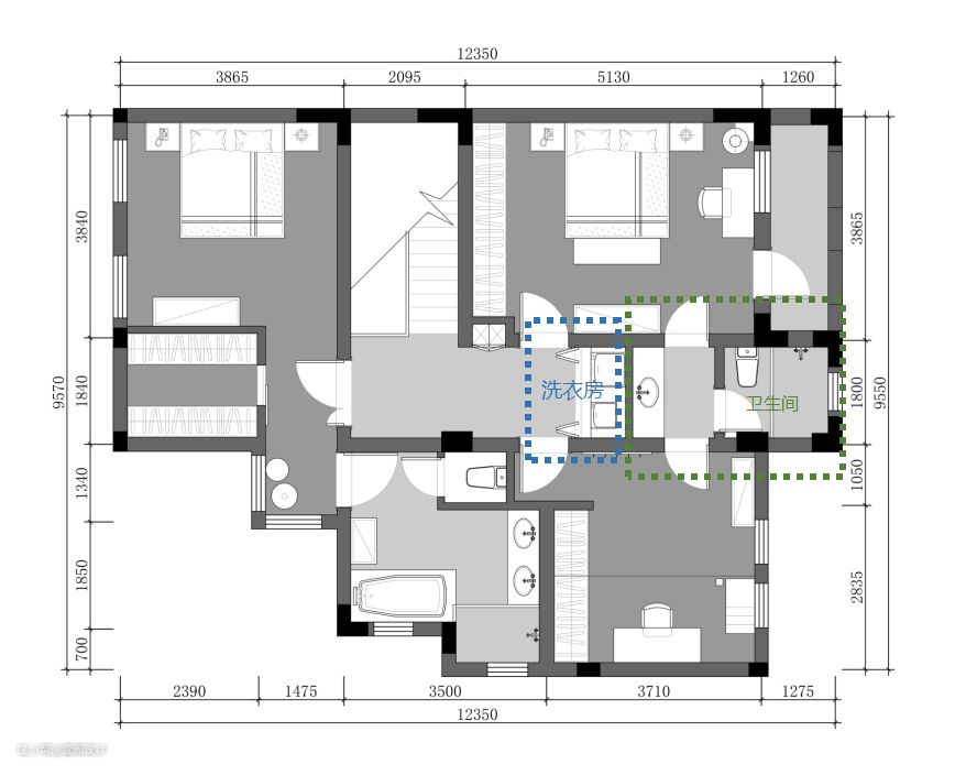 原户型父母房与儿童房相邻卫生间位于两间房中间,常规做法是将卫生间划分到某个房间内,变成卧室+卫生间与单卧室或者两个单卧室,单独划分卫生间这样都需要绕出门到走廊洗涮。