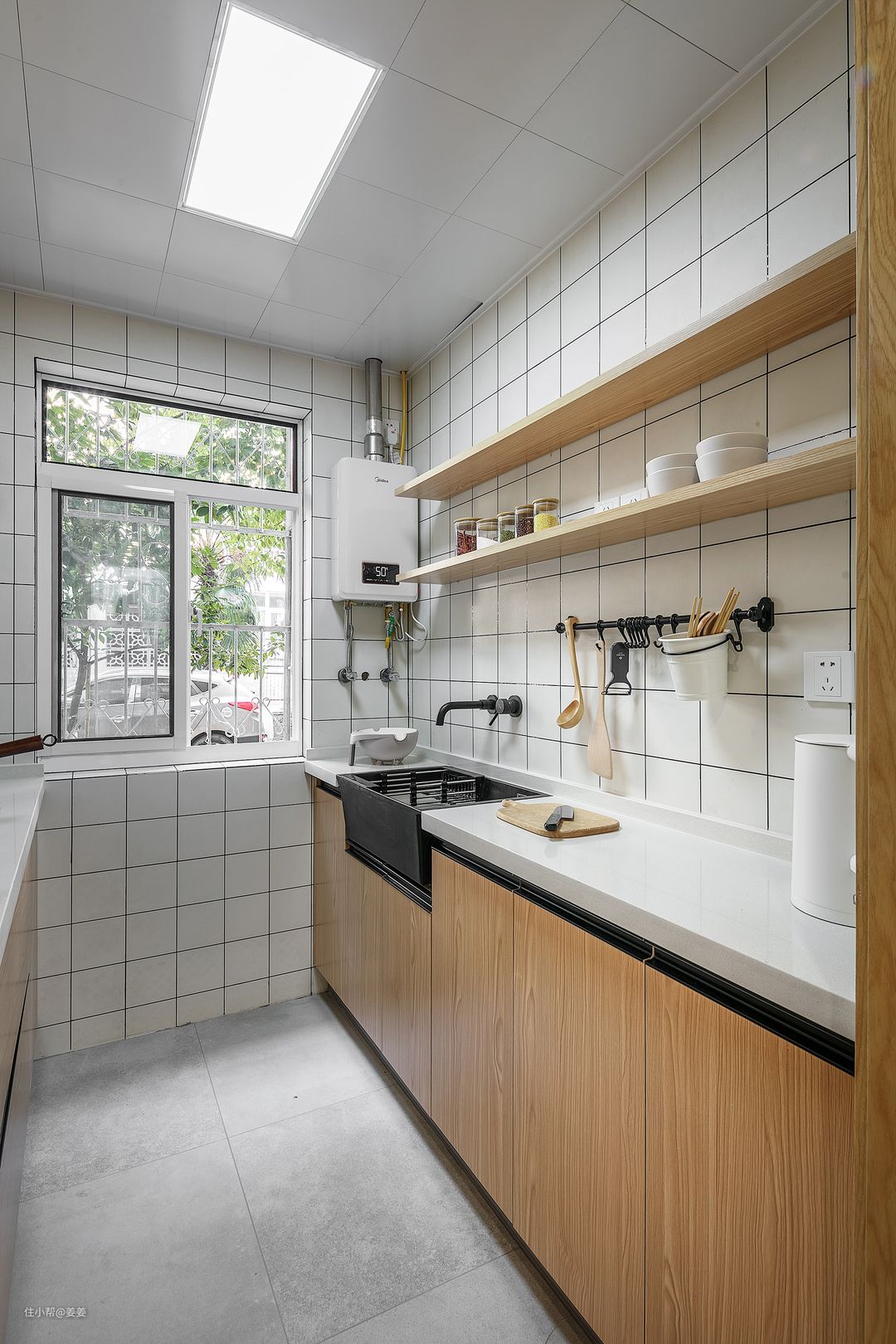 厨房我的要求就是清清爽爽的,重新规划了一下洗菜,切菜,烧菜的位置,尽可能多的做储物空间,大件收到柜子里,小件可以放在层板上和利用墙面的收纳,用到现在还是和拍摄时差不多的样子,收纳做好了,不会那么容易乱的。