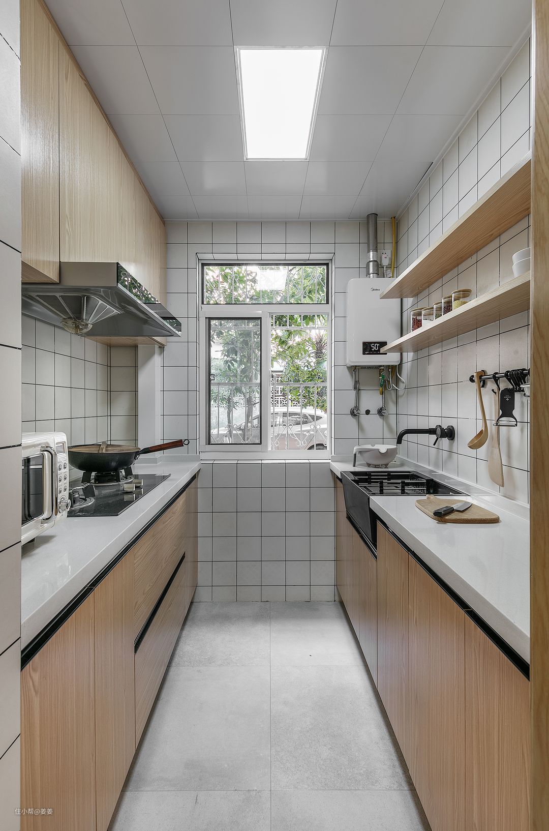 这点的操作台面设计师做了40公分的,水槽是刚好内嵌进去的,这样能保证中间的活动空间又1米,小是小了点,也能满足两个人同事操作,不过一般只有家里来人了,才会帮忙洗洗菜什么的,大部分时间都是一个人烧饭。