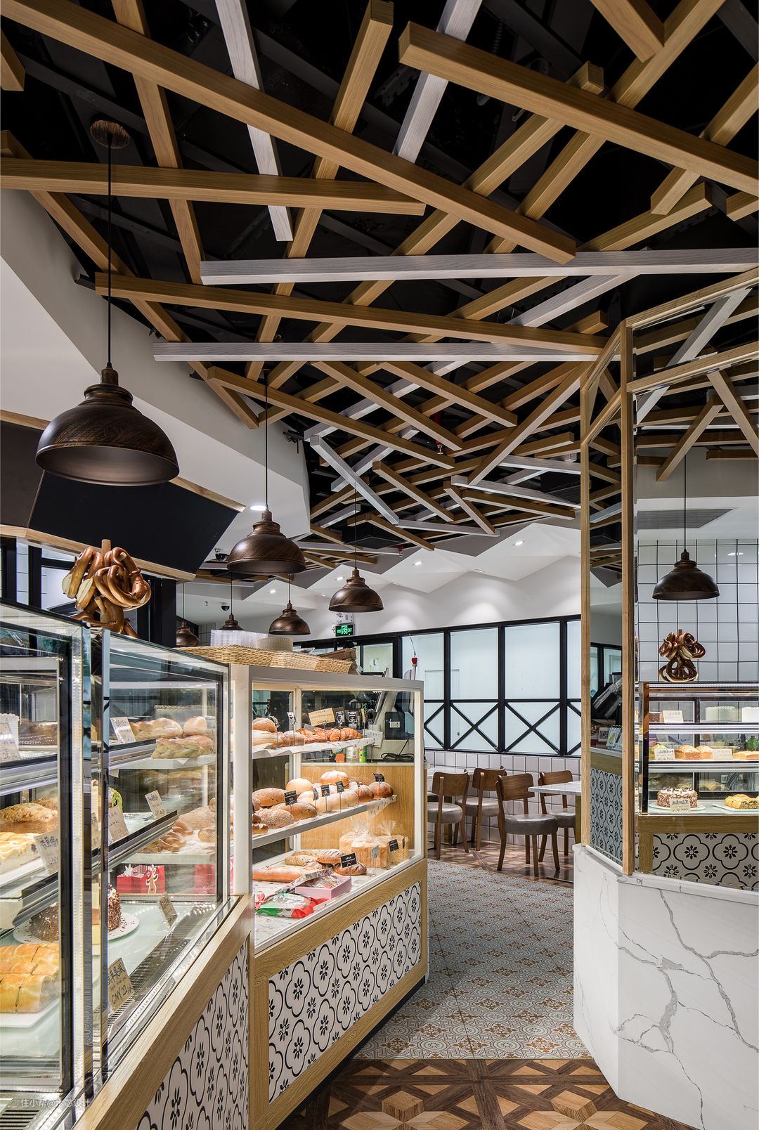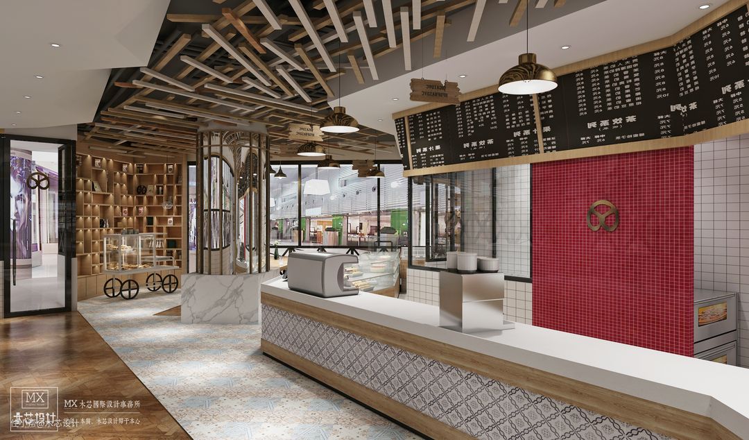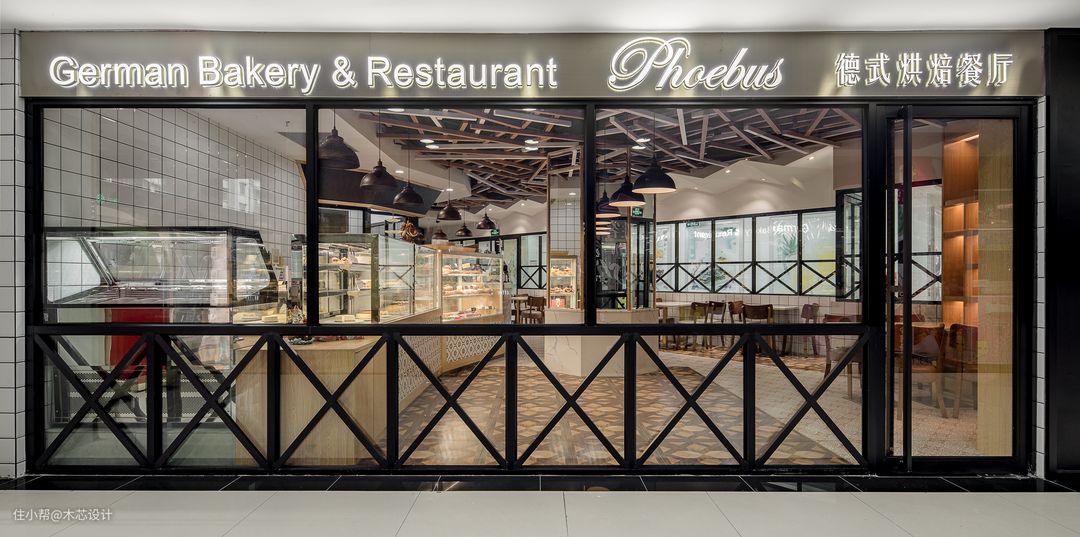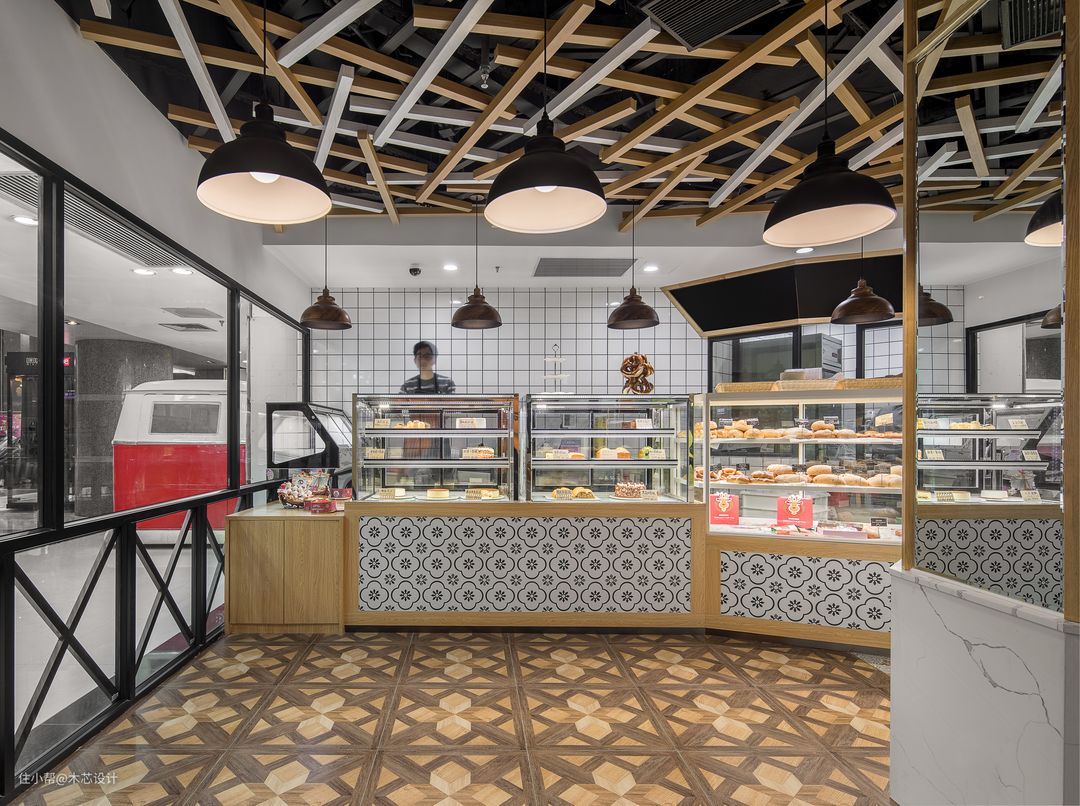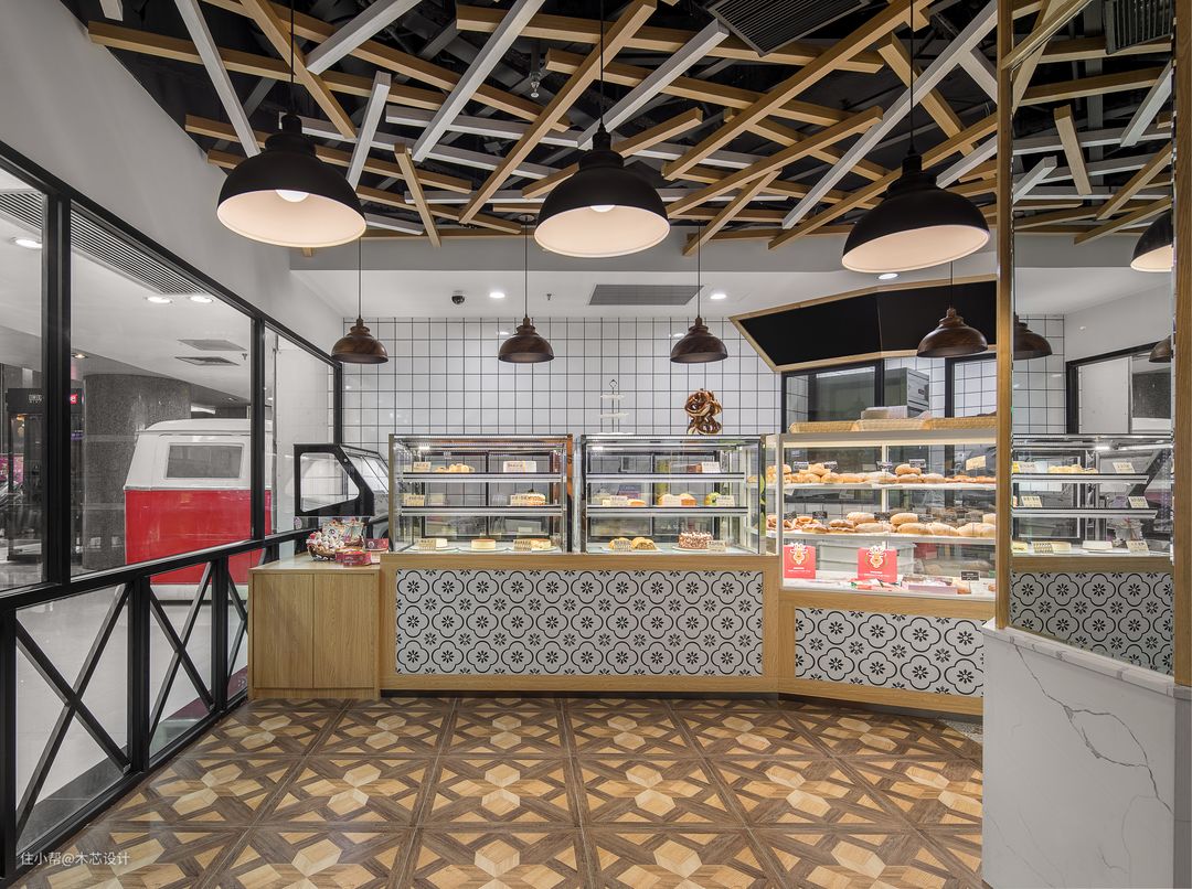“什么是设计? 设计是为构建有意义的秩序而付出的有意识的直觉上的努力。 设计,是指设计师有目标有计划地进行技术性的创作活动。 设计的任务不只是为了生活和商业服务,同时有伴有艺术性的创作。” |作品档案 项目地址:广东·广州·中华广场 项目用途:商铺 设计风格:现代风格 设计单位:木芯国际设计事务所 主创设计:Johnny |设计背景 在与两位业主初次见面时,深感他们对西点有种特别的情怀,“每家分店无论口味卖相或是店面形象我们都会努力做到最好”。这已不是业主的首家品牌店。在空间设计,他们期望这次能打破传统的面包店形象,能让顾客感受到不一样的异域气息。为了配合品牌的发展宗旨,Germen Bakery面包店需要拥有视觉冲击力的特征,能在众多周边的商铺和竞争对手中脱颖而出。因此关于面包店的门面设计,业主坚持要达到内心想要的标准。找到木芯设计前,曾找过其他设计公司,但设计效果理念并没达到自己的要求。他们爱天马行空、有想法的设计。设计师Johnny总是喜欢挑战与打破陈规。基于彼此的信任感,从确认主调,到每一砖一瓦,所有细节都有其存在的意义。