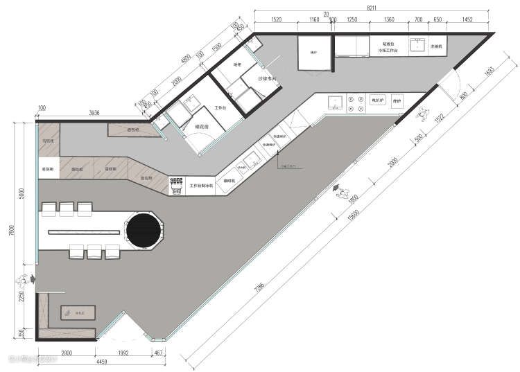 设计分析 本次空间规划,是从无到有的一个过程。起初量房时,外部只是简单的临时结构。除了内里的空间设计外,外墙造型也得考虑。整个空间的布局与划分应最大限度的让空间开阔,舒适,通透。满足商业功能所需的同时,也让每处细节尽显时尚与质感。 ①空间功能划分两大区。操作区与顾客休闲区,分区明显,互相建立联系却互不干扰; ②操作区砌以实墙,保证业主的商业私密性,操作区采用玻璃隔墙。使空间更具通透性; ③操作区除了开放式操作空间外,根据业主需求设置了裱花房与沙律间。增加使用的功能性; ④西点展示区,采购,制作均以“衔接式”布置,操作更合理,便利,快捷。