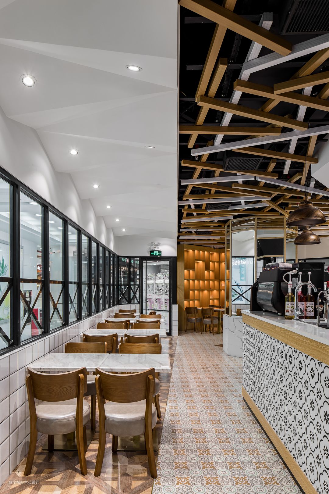 空间顶部用大量参差不齐的木条框装饰着整个空间,虽然看似因参差不齐而略显乱,但都是经过设计师精心设计与考量,这样设计为空间增加了节奏感和层次感。 白色瓷砖贴满墙壁与休闲桌进行和谐的统一,工业风格的灯具为空间增加了个性的味道。