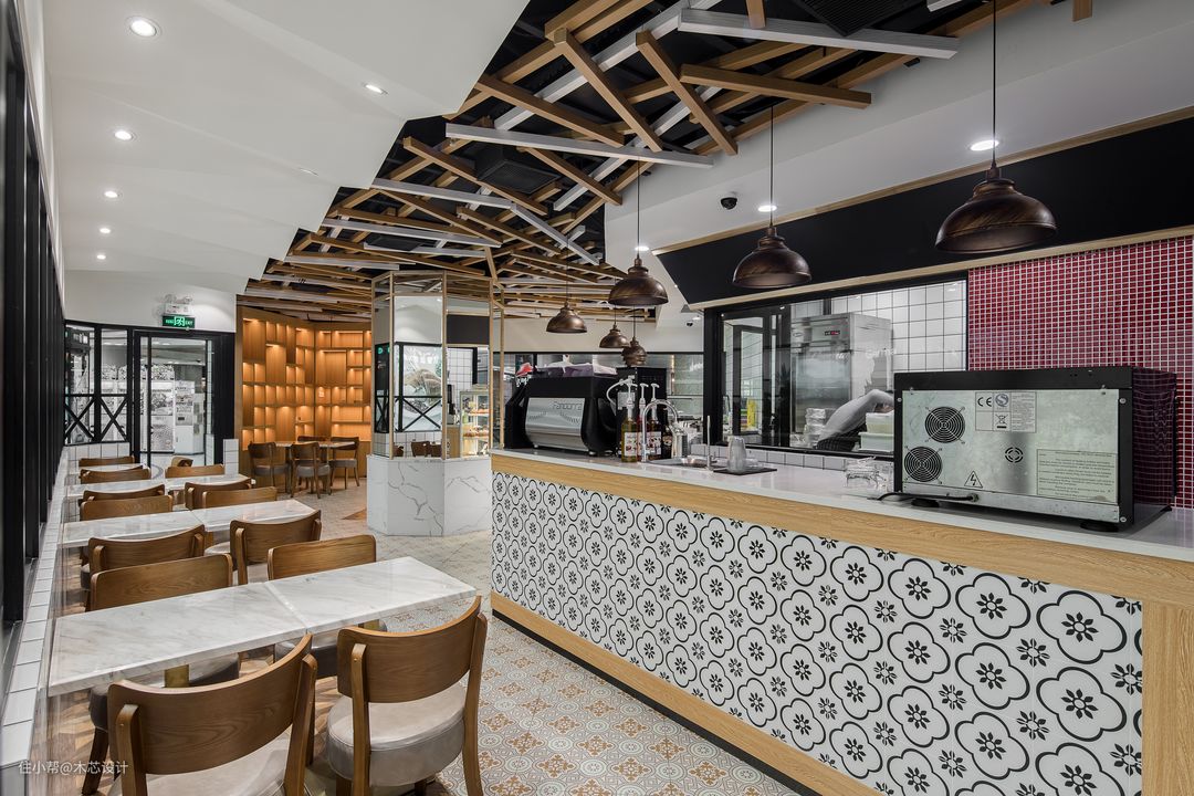 “人世间,最长情的告白,大抵就是吃东西时,你的距离,抬头可见,陪伴日短,温情渐长。” 休闲区中的天花设计造型赋予菱形几何感,更突显了店铺的现代风,休闲桌脚架采用拉丝香槟金装饰加深了高级感,配以皮垫原木色椅子,除了增加舒适度,还能加入休闲复古的气息。
