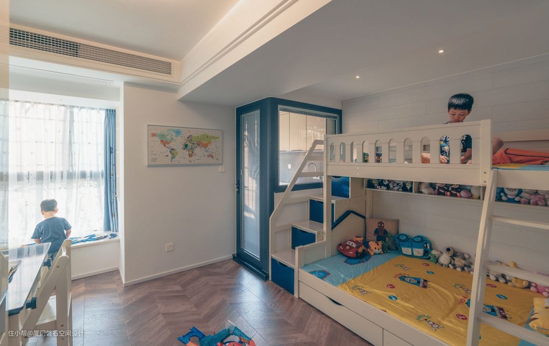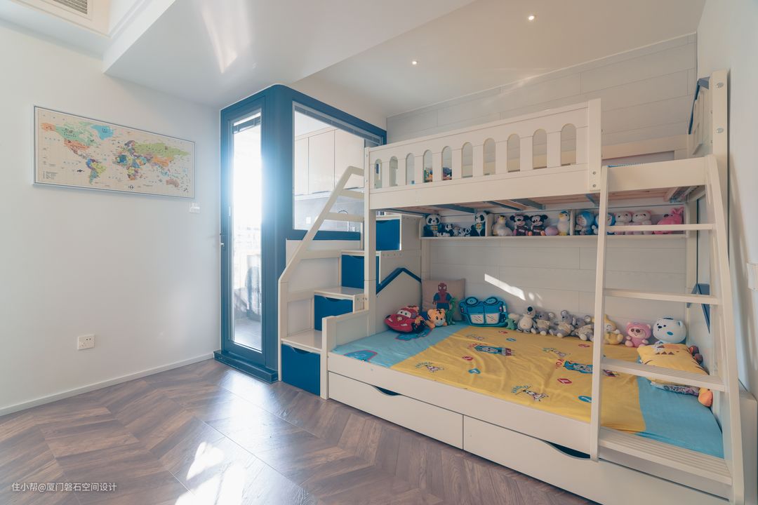将阳台一份为二,并入儿童房的那部分,放置了小家伙们都非常喜欢的这款高低床,充满童趣,而且功能超多,台阶可以放些玩具或者袜子之类的东西,床下也可以收纳小件衣物。