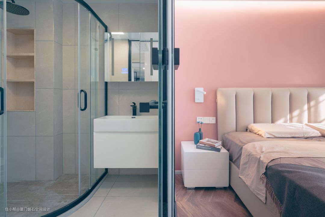 利用原凹陷墙面增设柜体,用来存放卫生用品和清洁用品;浴室延续了简洁明了的调性,壁龛用来提供放置洗护用品。