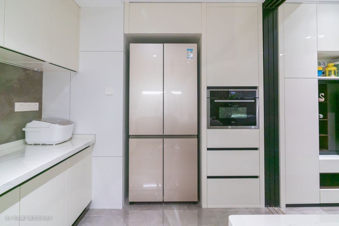 L形地柜及吊柜保证了台面的整洁,连冰箱都是提前量好尺寸内嵌至橱柜内的。