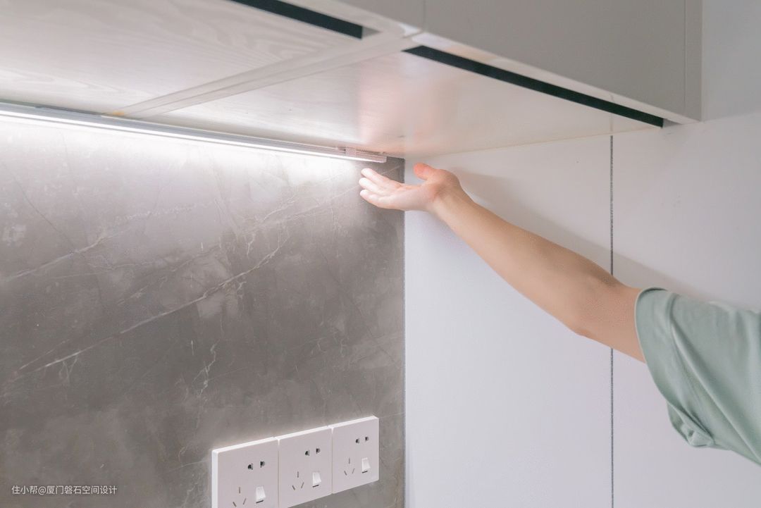 别小看吊柜下面这个感应灯,使用起来非常方面,再也不用担心切菜时身体挡光了。