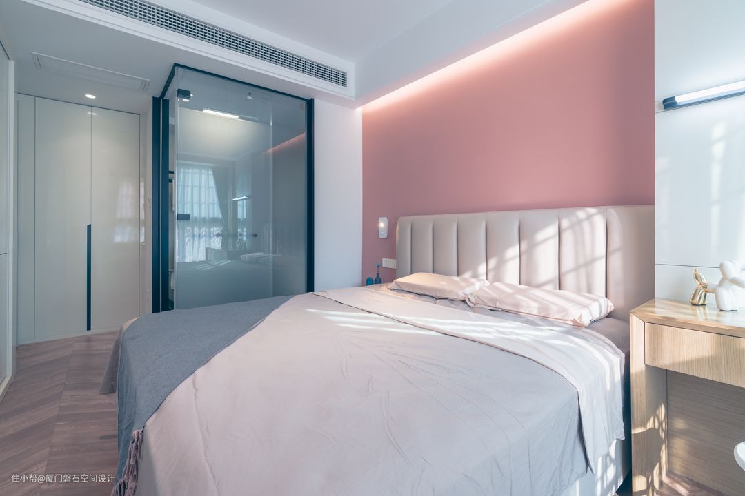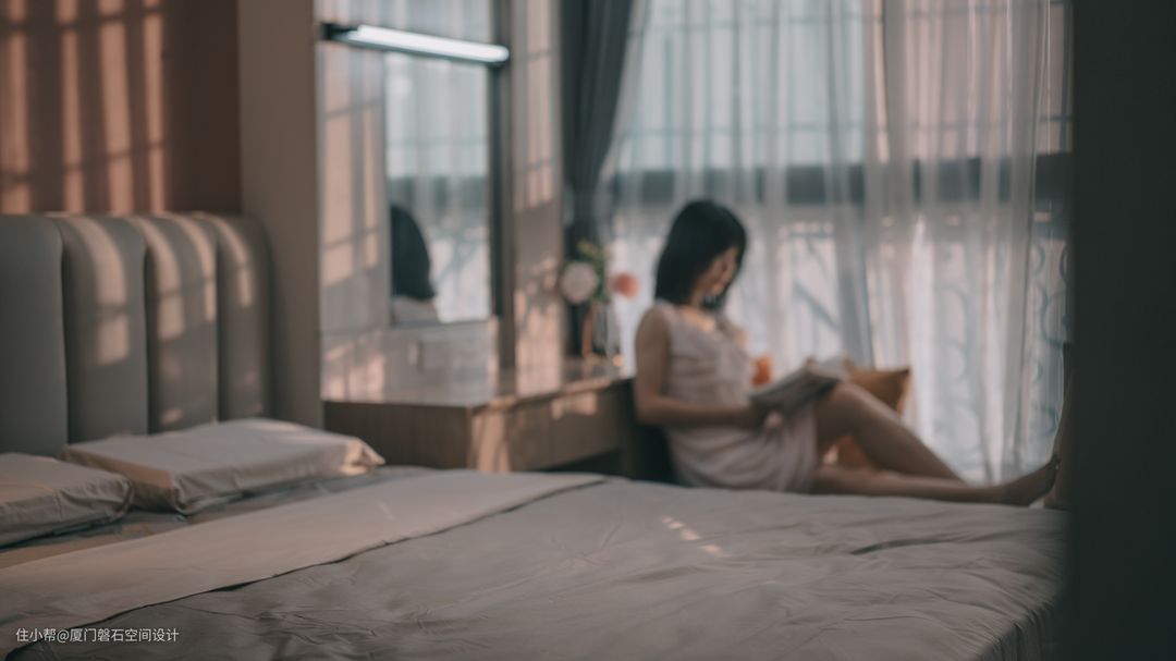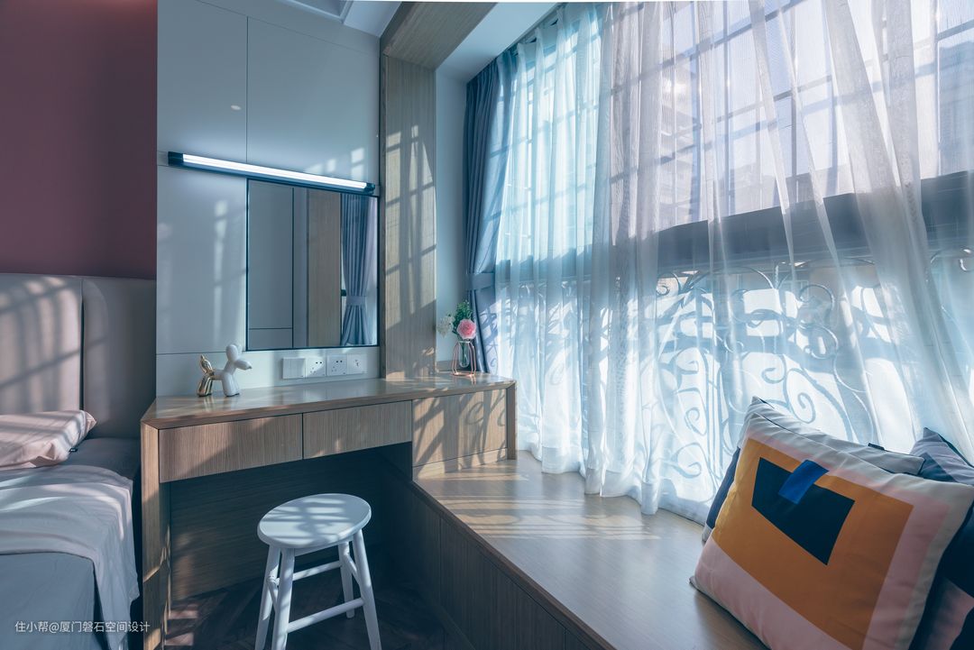 窗边增设一排矮柜,定制梳妆台代替了右边的床头柜,大面积飘窗带来了极好的视野和光线,每天化妆都要美美的。
