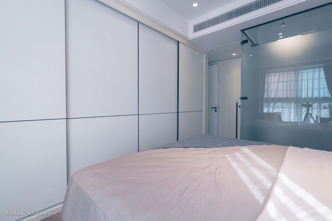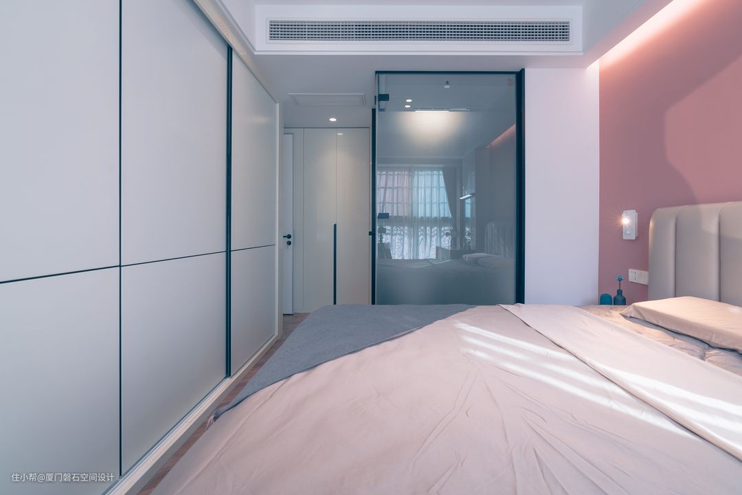 床尾3900mm*550mm的大衣柜是全屋最大的储物柜,柜体内全部安置活动层板,让储物更加灵活。柜体与床尾距离670mm,设计师可谓每一寸都在计算,每一寸都在抢。