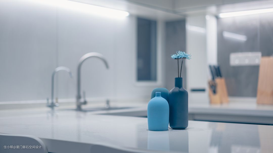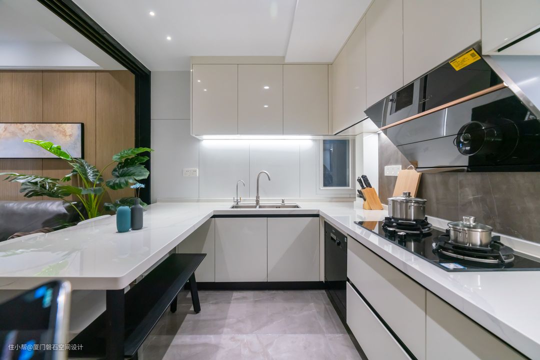 餐桌是橱柜台面的延伸,采用的是20mm加厚石英石台面,抗油污、耐磨、硬度高。两个相对独立的空间就意味着各空间都有自己的摆放和活动区域,将厨餐厅相连,既减少浪费空间,增加厨房操作台面,同时也能增加家人之间的互动。
