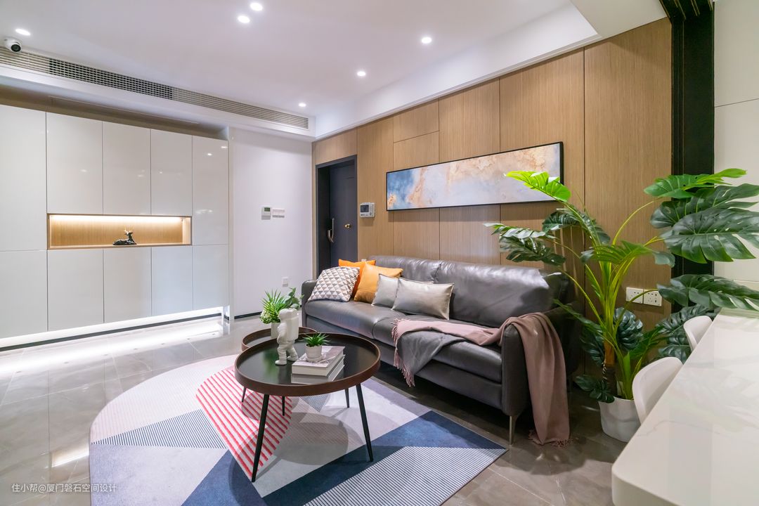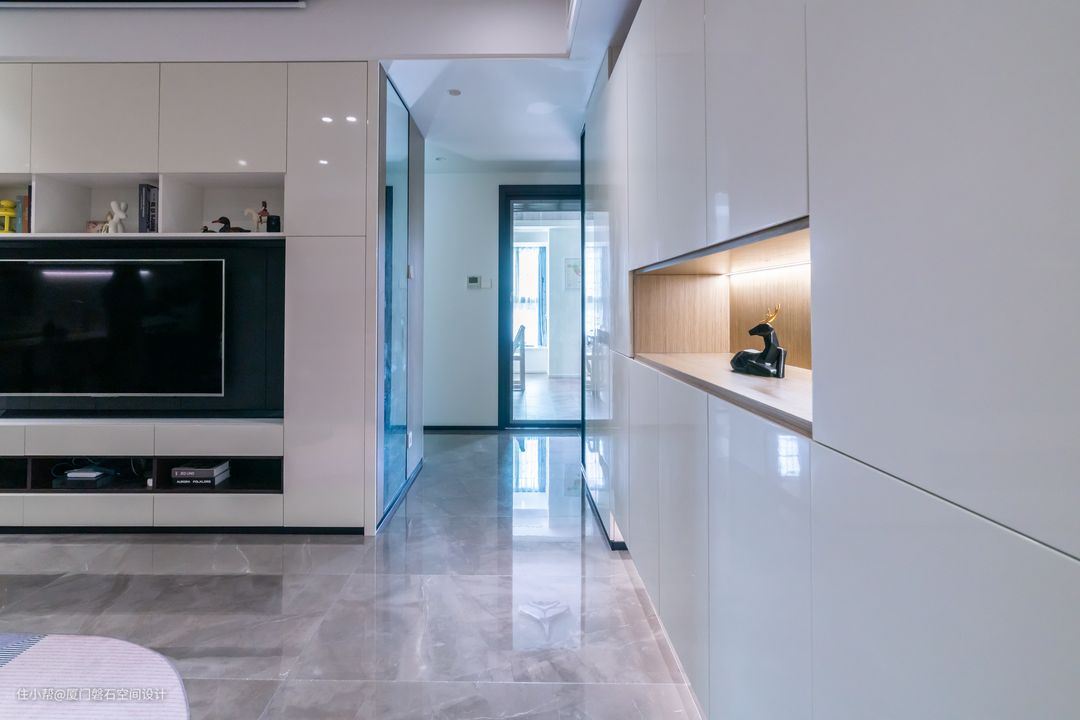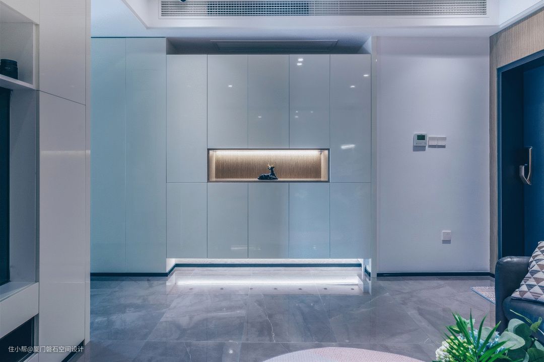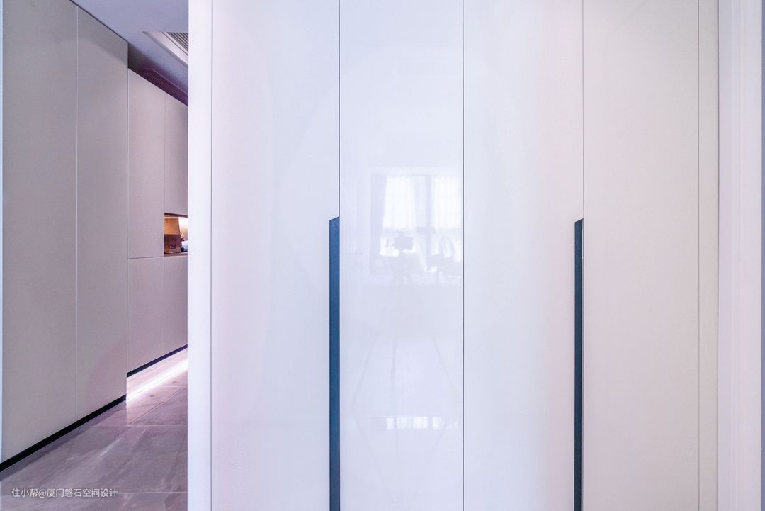 原始户型一进门就是客厅,缺少实际的玄关空间,设计师巧妙利用入户门右手边凹凸墙面,做了一整面白色烤漆面板收纳柜。