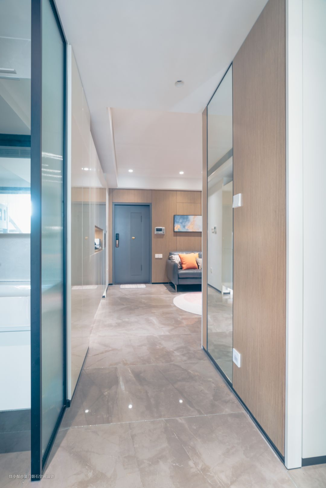 从这个角度可以看到由走廊延续过来的柜体(主卧门后的整面收纳柜)。