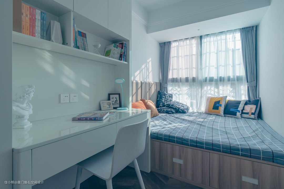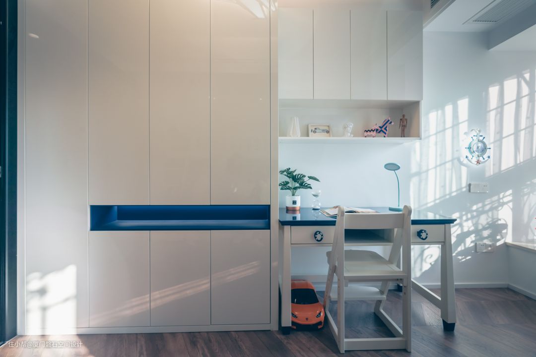 衣柜和书柜同样是这个房间的标配,但它和儿童房不同的是,色彩上少了一抹蓝,虽少了一分活泼却多了一份沉稳和安静。
