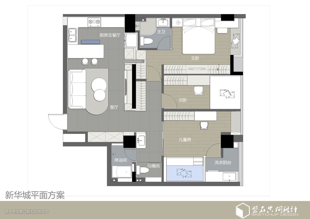 本案是业主陈小姐和先生一起为两个宝贝购置的学区房,在这寸土寸金的厦门岛内,为了孩子奋斗的家长们真的相当不容易。房屋面积不足90㎡,格局不合理、公共区域客厨卫几乎为暗室,采光极差,而且有两个孩子的家庭,总免不了有强大的收纳需求;重视家人之间的沟通和交流,希望孩子有玩耍的区域,有家人之间有足够的相处空间……