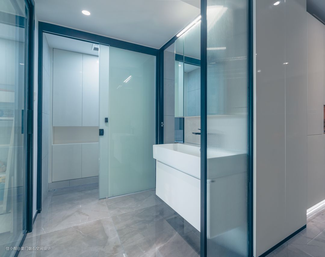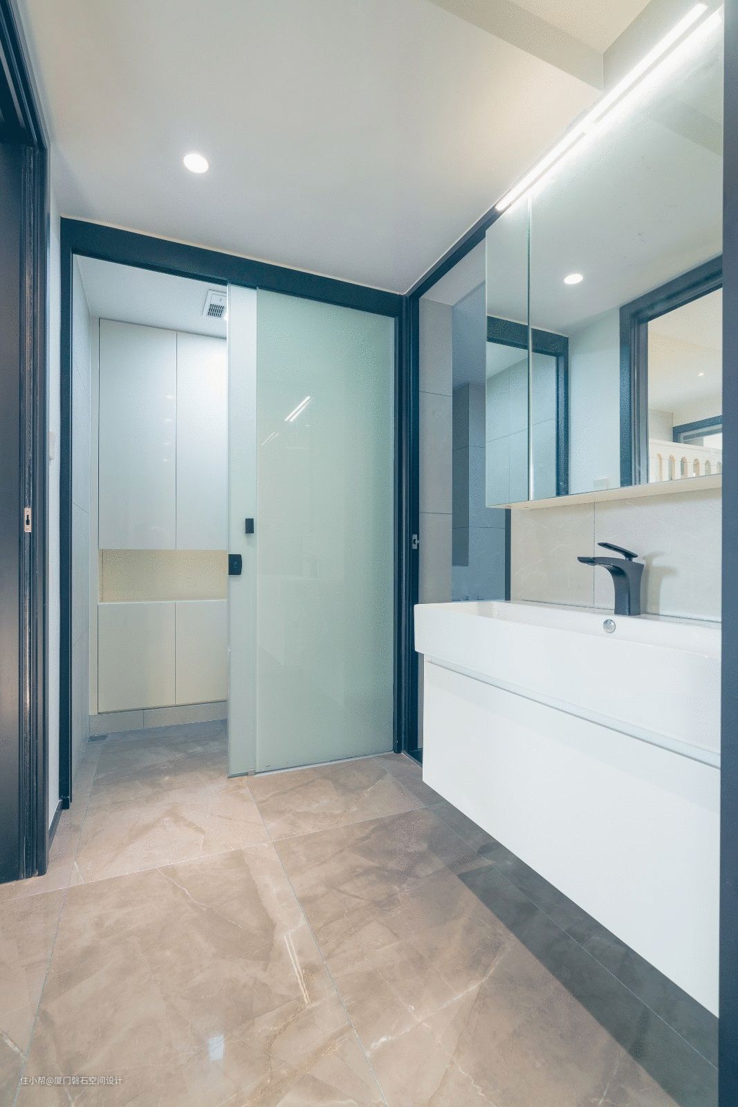 厨房向主卫空间“借”了部分空间,为的是将冰箱柜与电视背景墙的厚度拉平,视觉上整体性更强,视觉也得到了延伸。