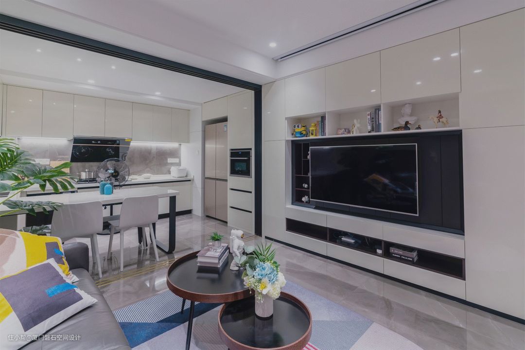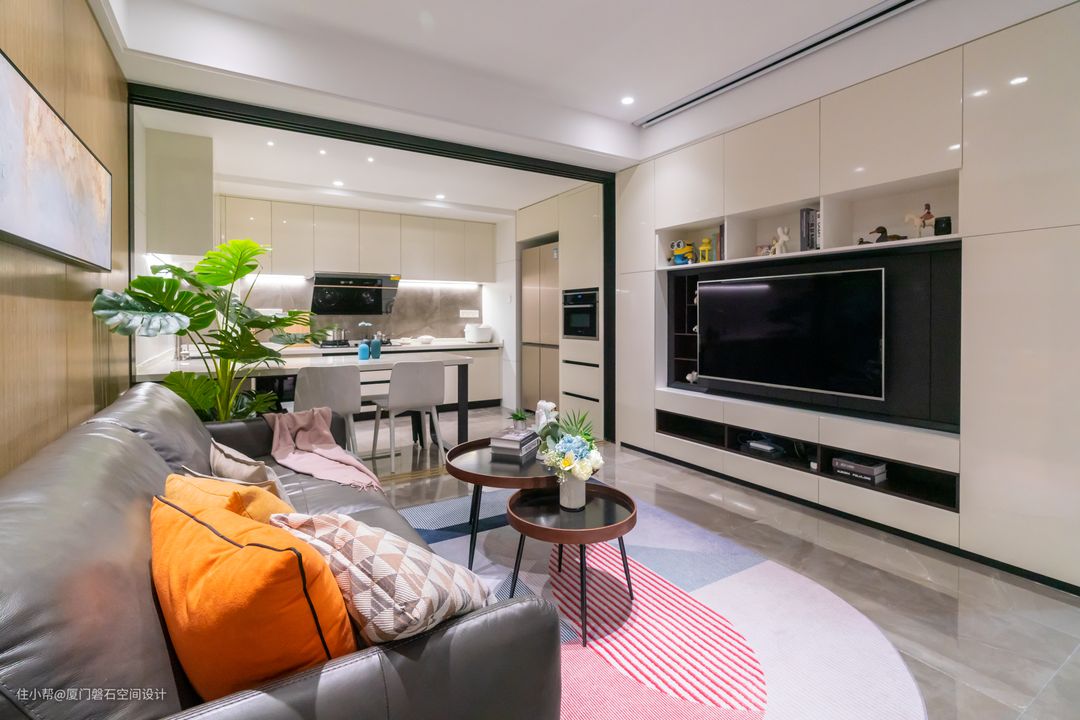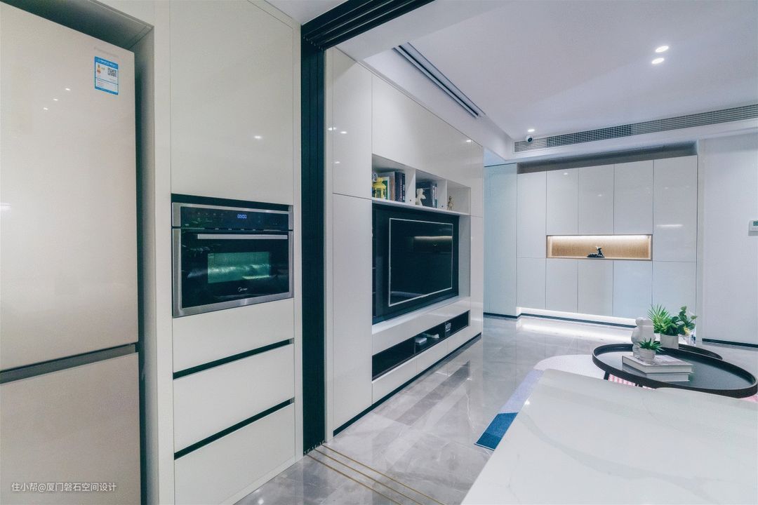 而更重要的是,我们厨房冰箱柜与电视背景墙的厚度拉平,在视觉上更像一个整体,减少了空间的不平整,更拉长了我们的视觉感官。