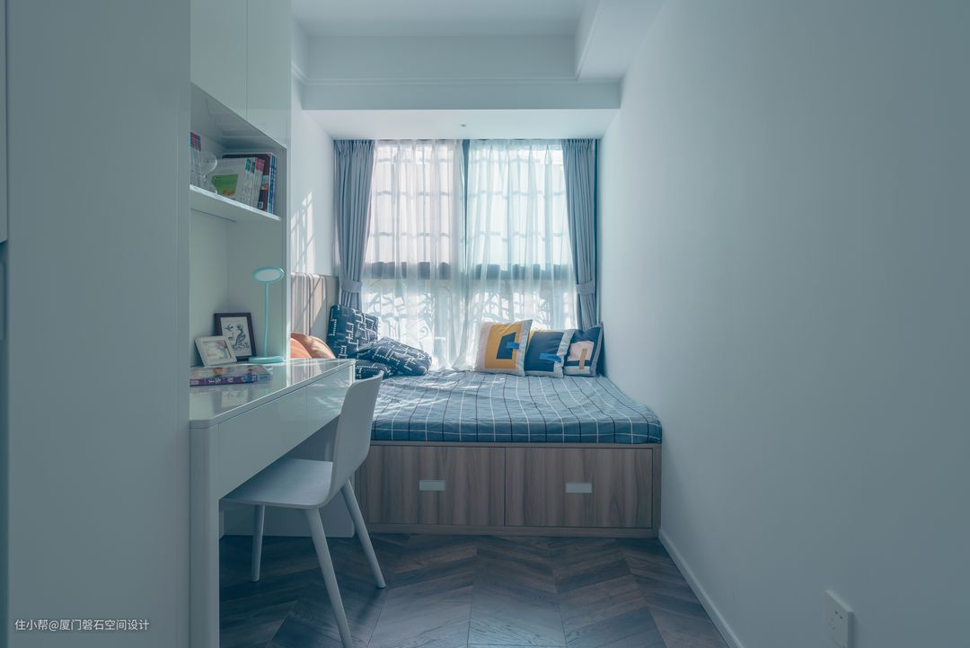 房间的净宽刚好好2000mm,一张床的长度。床头为防止划痕,特意设计了软包,美观实用。最重要的是,榻榻米式的设计是业主的重点需求,很多杂物到时候都是要存放到这里的,比如:夏天时候的冬被,冬天时候的风扇,还有孩子们已经长大,再也穿不了又舍不得丢掉的某件衣服.......