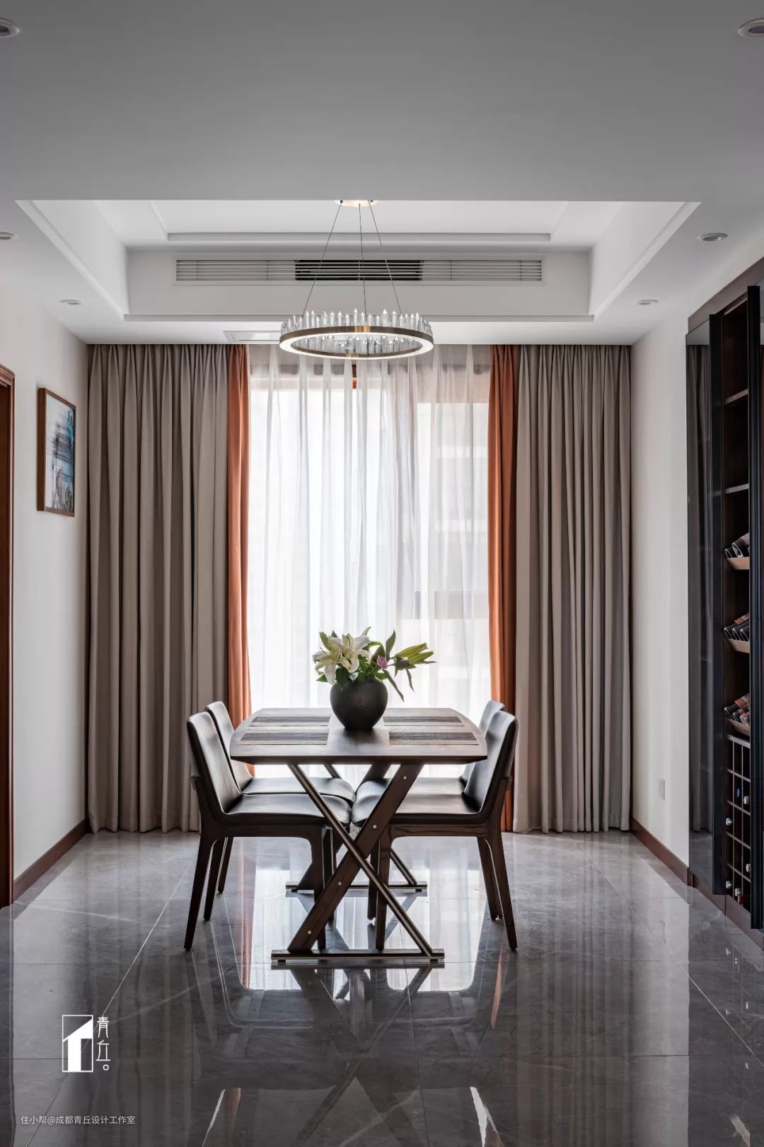 ■因为要安装中央空调,所以客餐厅都做了吊顶。四人餐桌摆于餐厅正中心,桌椅纹理细腻,双面阳台的窗帘均使用精选的进口材质,手感非常舒服,选色上也继续保持内敛和活力兼并。
